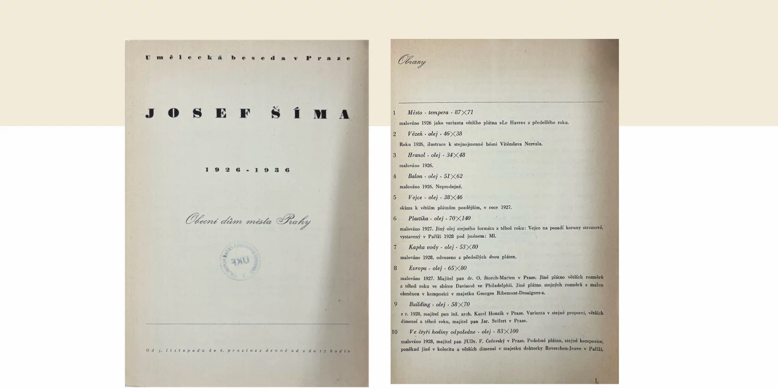 Exhibition checklist from the catalogue of the jubilee exhibition JOSEF ŠÍMA 1926–1936, organized by Umělecká beseda (Artistic Forum) in Prague from November 5 to December 6, 1936. This catalogue not only lists the exhibits displayed at the exhibition but also functions as a ‘working’, personal ‘inventory’ of Šíma, which, besides the works presented, in several cases also mentions other existing paintings with the same motif and their locations. Listed under #8 is the Moravian Gallery version of Europa. It later states the existence of ‘another larger canvas from the same year in the Davis Collection in Philadelphia.” A third canvas of the same size with slight variations in composition is also noted as in the collection of Georges Ribemont-Desaignes.