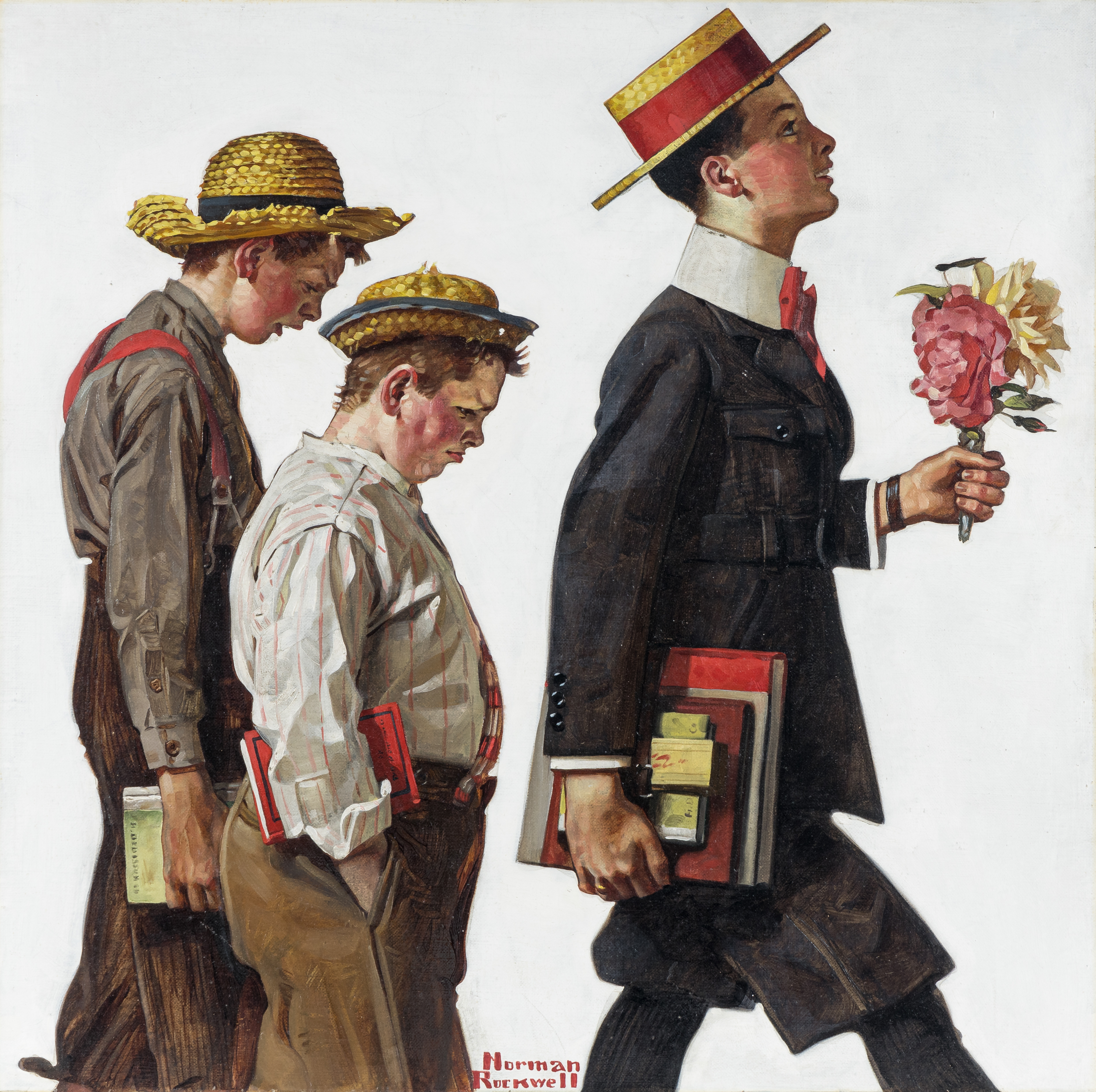 Only One More Week of School and Then… represents Rockwell’s light-hearted, charming narratives featuring children. Rockwell’s ability to render the universally understood emotions of young boys, ranging from misery to delight, is on full display here. The upturned, sprightly face of brown-nosing Reginald, who firmly carries in one hand his schoolbooks and with the other, a bouquet for Teacher, contrasts sharply to the downcast, petulant demeanors of his bumpkin cousins, who are miserable at the thought of another week of school before summer vacation. The next and last painting in the series after the present work, Vacation!, swaps the emotions of the boys, with a despondent Reginald trailing behind a jubilant Tubby and Rusty.