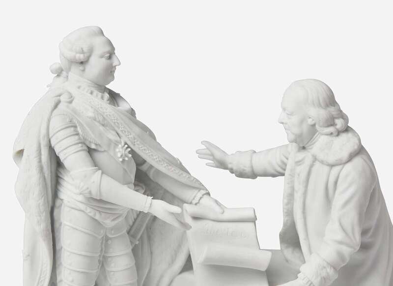 A rare commemorative unglazed porcelain figural group of French King Louis XVI and Benjamin Franklin, attributed to Charles-Gabriel Sauvauge (French, 1741-1827), Niderviller Factory (France, active 1754-1827), circa 1780 | Estimate: $15,000 - $25,000