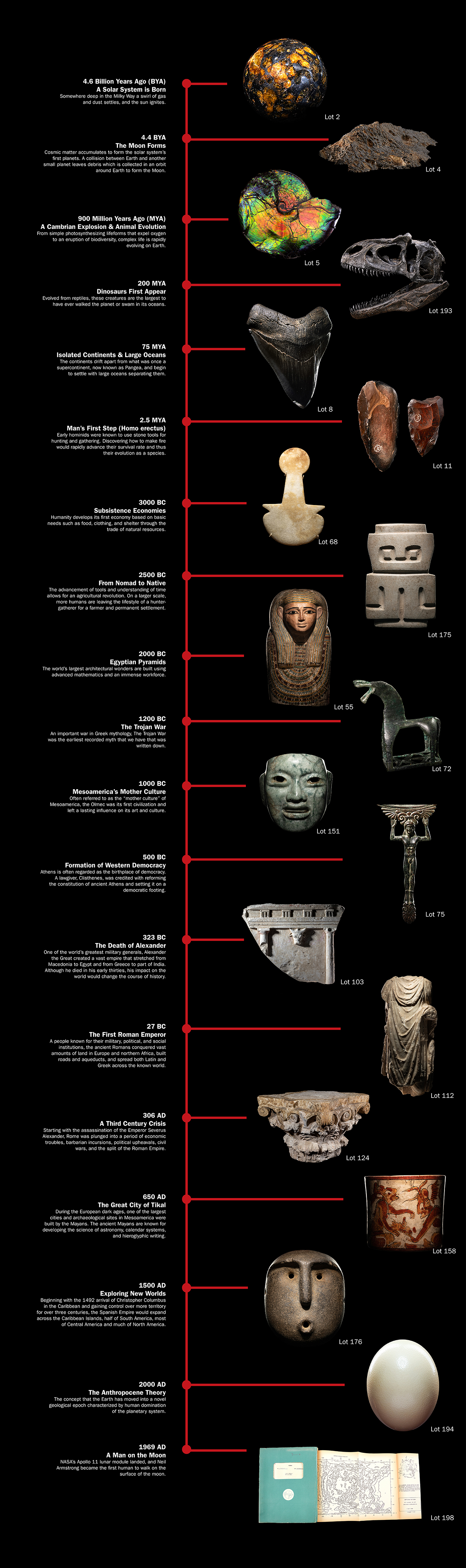 From the birth of our solar system to man’s exploration of it, Hindman’s Ancient Art & Natural History: A Cabinet of Curiosities examines the natural wonders of our world and the evolution of our species within it. The inspiration came from Europe’s Age of Enlightenment and the creation of Wunderkammers. In 1565, Samuel Quiccheberg published his seminal work on the collection and display of objects titled Inscriptiones, which would later serve as the rationale for the world’s first encyclopedic museums. According to Quiccheberg, the ideal collection was ‘a theatre of the broadest scope, containing materials and precise reproductions of the whole universe’. Seen here is a timeline with wonderous objects sought to inspire others to develop their own cabinets of curiosities.