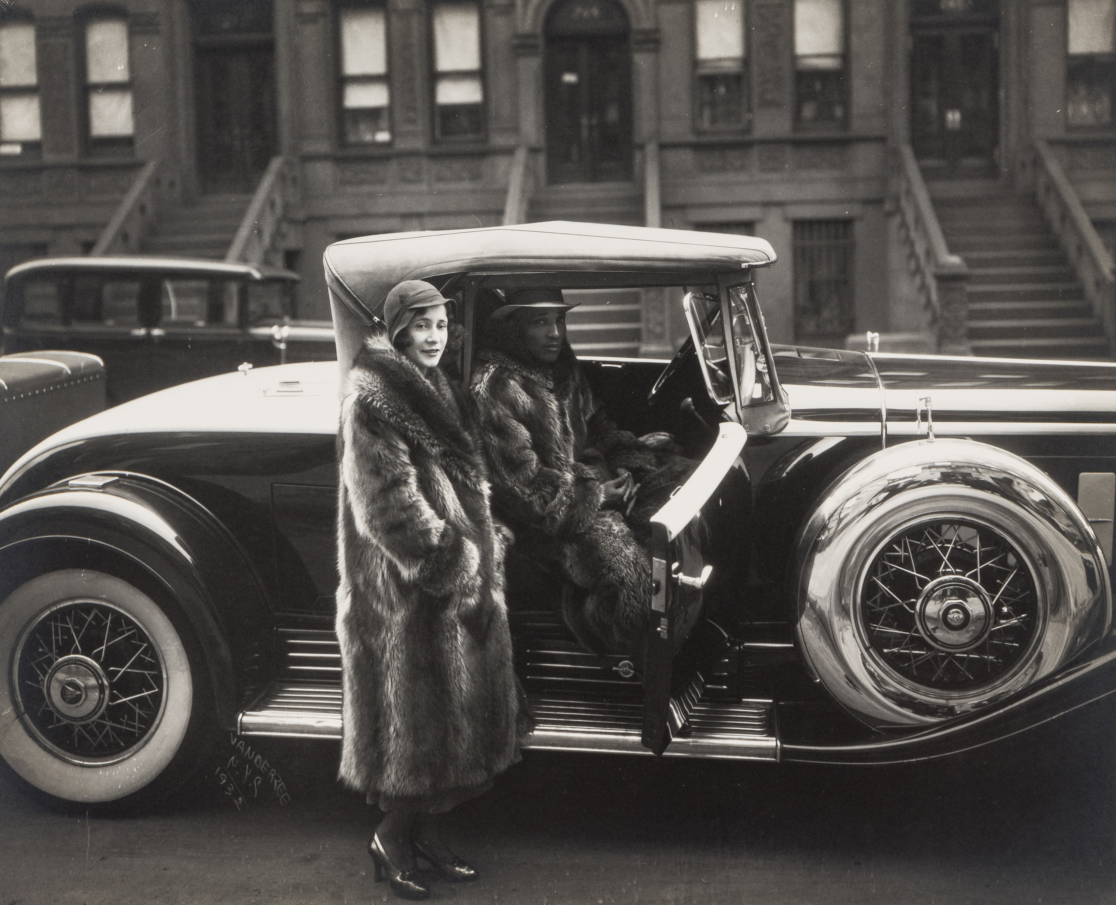 James Van Der Zee created a rich portrait of African American life in Harlem during the first half of the 20th century. Catering to the growing population of the neighborhood, he used painted backdrops and photographic manipulation to make cosmopolitan portraits in his studio. Van Der Zee also photographed Harlem storefronts and local athletic, spiritual, social, and political groups.