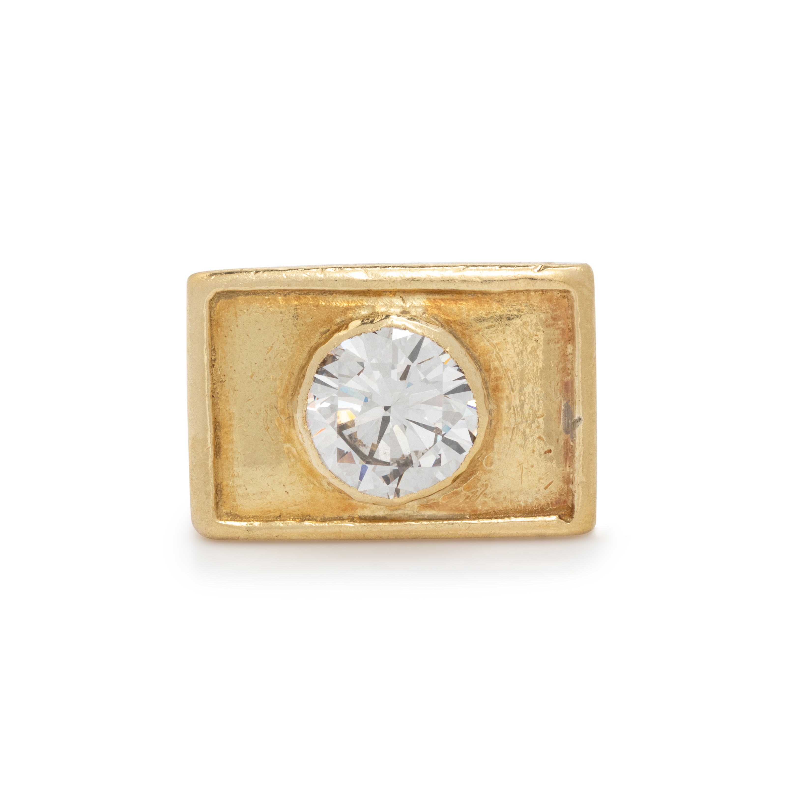 Perfect for the gold jewelry collector, this captivating Yellow Gold and Diamond Ring makes a statement on any ring stack. The ring’s rectangular shape juxtaposed against its central circular diamond make it easily pairable with a diverse range of necklaces, bracelets, and more.
