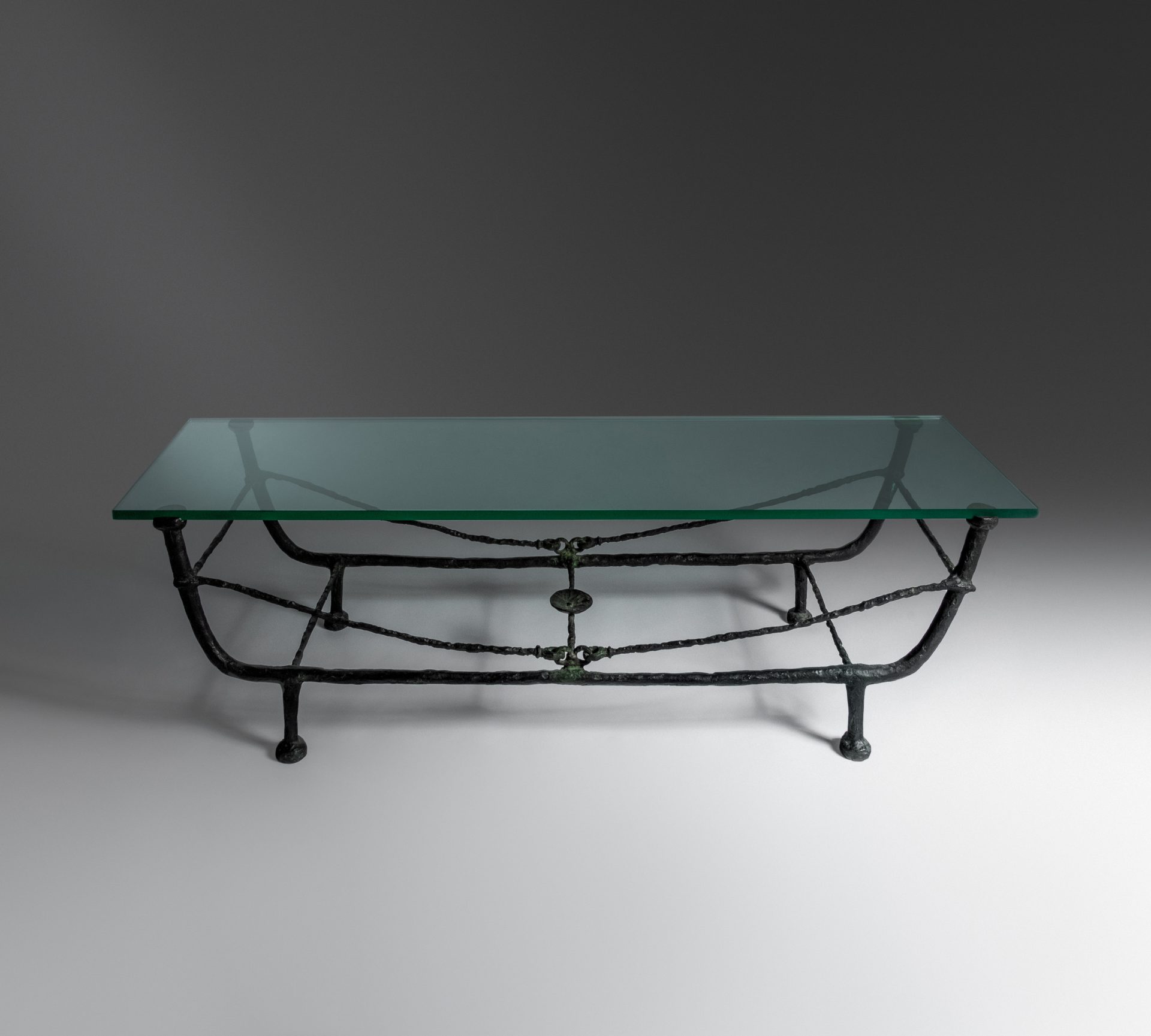 Raised in the Swiss countryside surrounded by an artistic family, Diego quickly adopted his natural surroundings as a primary source of inspiration. Consistently throughout his oeuvre, we find isolated elements of naturalistic inspiration consciously placed to draw our adoration to the material. While the use of animal iconography was most commonly used by the artist, La Table-Berceau, Première Version presents us with a single flower placed in the center, grounding us to the metal from the earth it came – connecting us back to the true original source material.
