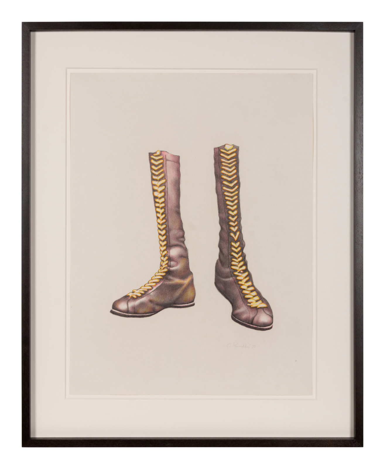 Boots, 1972, shows how visual concentration guided his pencil and crayons to an exacting, sculptural rendering that nevertheless retains a loose, almost casual, fading of edges. Thousands of bundled lines overlap, encircle and weave. They accumulate without effort. The boots are shown as in-use by an invisible wearer. Who? One thinks of bizarre militarism, maybe a crazed officer or costumed prankster. Elongated, too narrow, the boots convey oddness and tight discomfort. They are restrictive physical and psychological prosthetics. But the laces don’t bind. Instead they seem fluffy, almost like luminous chrysalises about to burst into butterflies — and freedom.