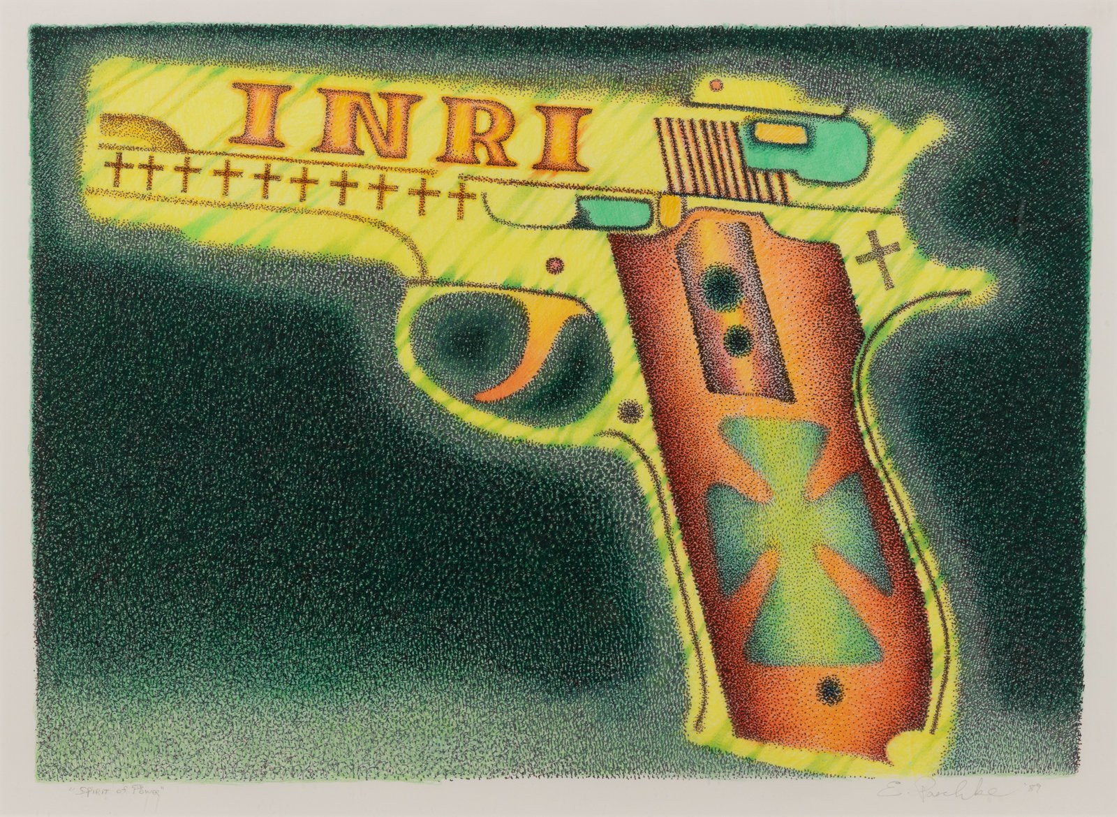 Spirit of Power, 1989, is a spectral image of a gun, one of many that Paschke made at this time. It’s an icon of gang violence and societal authority and defense, complicated further by the religious allusion of the INRI inscription and a cross. Meticulous rendering in several media, applied in succession, invite a visual delayering, as if peeling away the marks will reveal meaning. At this time Paschke was drawing over washes with ink dots that mimic his method of painting with the tips of small brushes, accumulating tone and illusion without obscuring the illumination from under-layers. There is a ritualist’s fondness for repetition in his method. It asks the viewer to participate in drawing and to contemplate the deceptive aura of an icon of sudden and terrible violence.