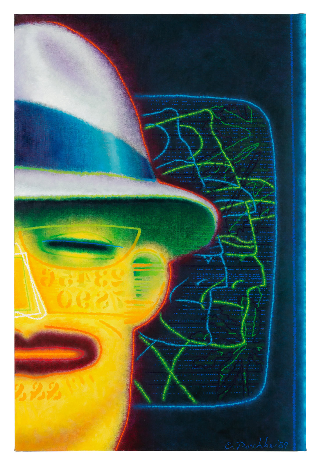 Tracer, 1989: The jittery, glowing face of the iconic comic strip Dick Tracy is surrounded by a TV screen and to its left a full color mirror image (also indicated by reverse numbers on the frontal face) of a wannabe Dick Tracy, a Tracer. The duo reflects the essential oneness of the two faces. The merging of icon with “the common man “ suggests the projection of self into cultural identity or the absorption of self by a fictional, flickering icon. The delicately painted surface is a clue to Paschke’s encouraging empathy for a Tracer, the character under a big 1940s gangland Fedora.