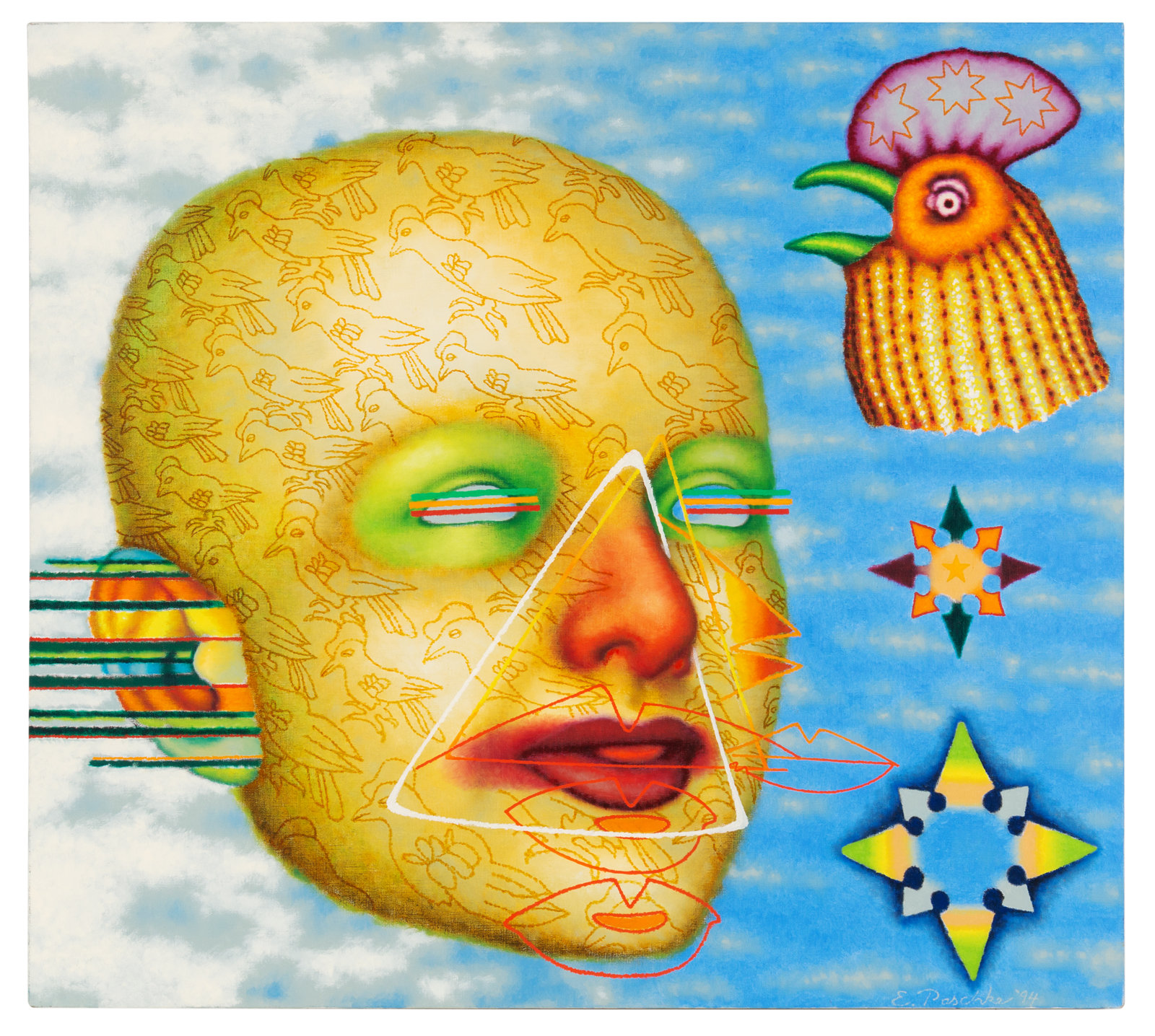 Sky Blue, 1994, represents Paschke’s moving on from the large celebrity or historical icon portraits of a few years earlier (such as his Elvis and Lincoln). Here Paschke reinvents a human scale generalized androgynous face overlaid with tattoo-like symbols of little chicks. They may be either dreaded or soothing chicks but they fill the head. (they may refer to his father’s inspiring carvings of birds). On the upper right a larger chicken without a wattle is neither fully hen nor rooster. This ambiguity leads us again to Paschke’s paradoxical law of opposites that resist efforts to explain his imagery as a simple narrative. Paschke employs wide ovals and lines to merge with the painted head. Together they suggest the five senses. Other symbols float nearby. It’s an uncertain private dialogue about personal identity happening in broad daylight. The paint application is more varied in this work, sometimes thick, vigorous; sometimes water thin and dotted, evoking the presence of studio hands-on working and experiment. Sky Blue shows how Paschke’s commitment to inventive at-the-moment problem solving was guided by his career-long maxim: “Show life in the picture plane.