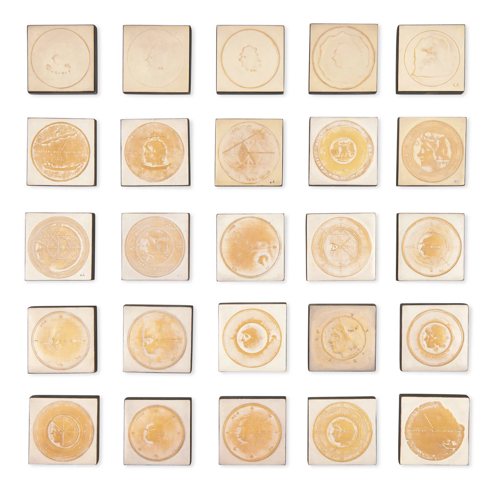 Over the course of his life and career, Thomas Chimes made the pursuit of his authentic voice his work, reinventing himself in the process as he moved through different phases. Chimes’ sensitivity to his time and cultural milieu expressed itself in different modes, outlined in Michael Taylor’s seminal exhibition catalogue for the retrospective exhibition at the Philadelphia Museum of Art in 2007, Adventures in ‘Pataphysics, as: Crucifixion Paintings, Metal Boxes, Panel Portraits, and White Paintings. Freeman’s | Hindman presented engaging works from each of these groups, elucidating the extraordinary depth of the artist’s work throughout his life. While Chimes’ literary and philosophical source material can appear esoteric and conceptual, his paintings remain personal, authentic, and enlightening.