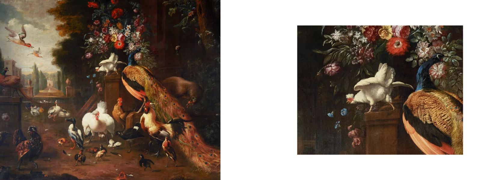 However, the Philadelphia version reveals intriguing differences. Enlarged along the left and lower edges, and showing clear variations in handling between the central and peripheral figures, the work likely emerged from a collaborative or workshop context. Correspondence from 1990 between the Museum and Dutch scholar Fred Meijer proposed that the exuberant floral passages were painted by Philip van Kouwenbergh (1671–1729), a still-life specialist who often borrowed motifs from d’Hondecoeter’s compositions. The delicate blossoms and luxuriant vegetation indeed align with Kouwenbergh’s style, while the birds themselves repeat signature Hondecoeter motifs (such as the cluster of chicks in the foreground, echoing the Seven Chicks study now in the Rijksmuseum).