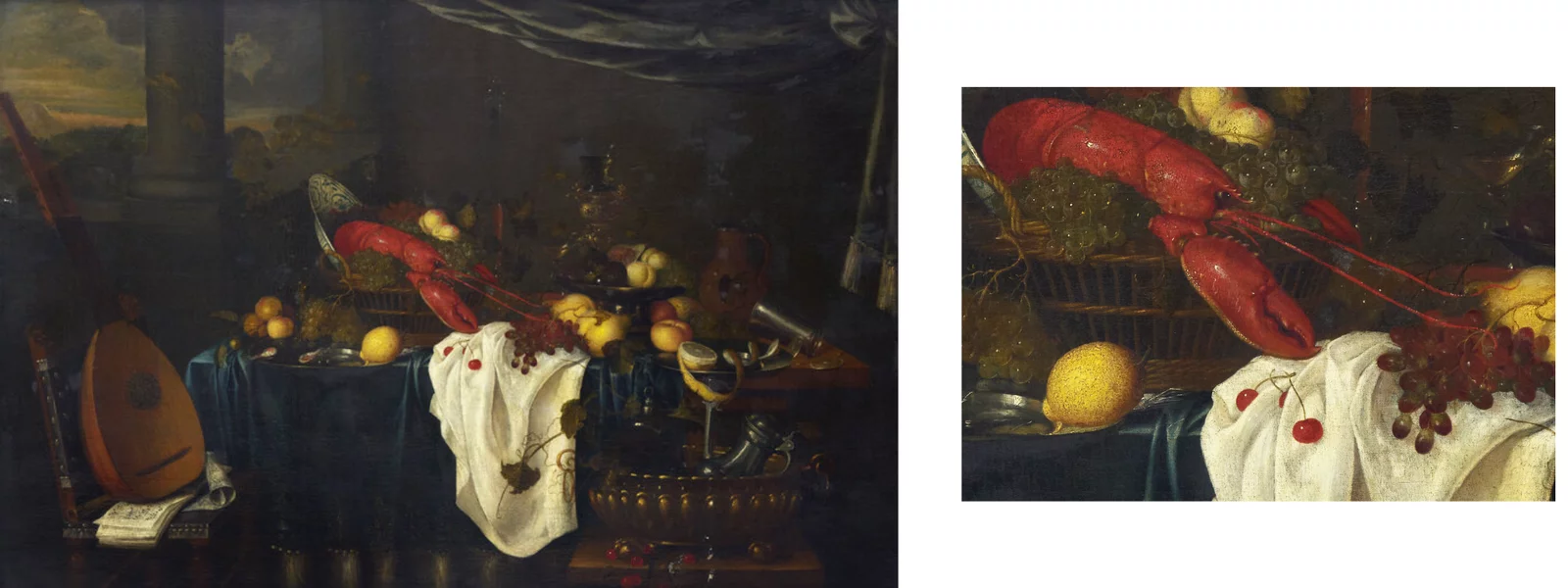 Recent scholarship by Professor Fred Meijer identifies the signature and date as later additions, instead linking the work to de Coninck, one of the earliest Antwerp painters to reinterpret Jan Davidsz. de Heem’s lavish banquet scenes on a more intimate scale. Here, the central lobster perched atop a wicker basket serves as a compositional anchor, drawing the viewer’s eye through the surrounding fruit, glass, and reflective metal. Subtle chiaroscuro, a restrained palette, and de Coninck’s characteristic attention to texture—seen in the curling sheet of music, the half-filled goblet, and the glistening fruit—imbue the work with both grandeur and quiet melancholy.