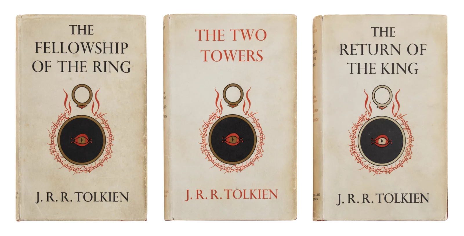 · Lot 208 | Tolkien, J.R.R. (1892-1973). [The Lord of the Rings trilogy:] The Fellowship of the Ring. 1954. -- The Two Towers. 1954. -- The Return of the King. 1955. All London: Allen & Unwin Ltd. First edition, first impression set. Estimate: $15,000 – 20,000