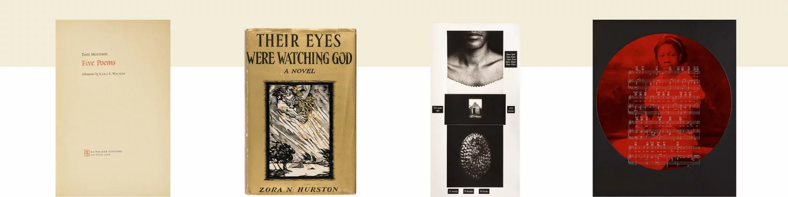 Morrison, Toni and Kara E. Walker: Five Poems | Sold for $3,302; Huston, Zora Neale. Their Eyes Were Watching God. 1937. First Edition in the Rare Dust Jacket. | Lorna Simpson (American, b. 1960) Counting, 1991 | CARRIE MAE WEEMS (AMERICAN, B. 1953) "GOD BLESS THE CHILD"FROM THE SERIES "FROM HERE I SAW WHAT HAPPENED AND I CRIED"