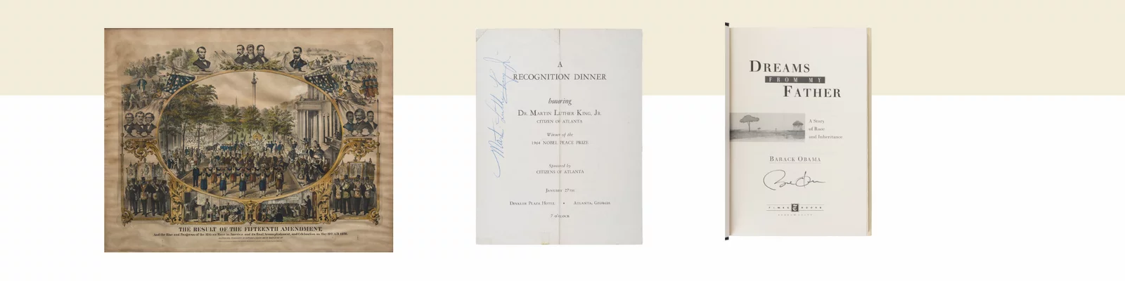 [African-Americana] The Result of the Fifteenth Amendment, And the Rise and Progress of the African Race in American... | [African-Americana] King, Martin Luther, Jr. Signed Program | OBAMA, Barack (b. 1961). A group of 4 FIRST EDITIONS, ALL SIGNED, comprising: