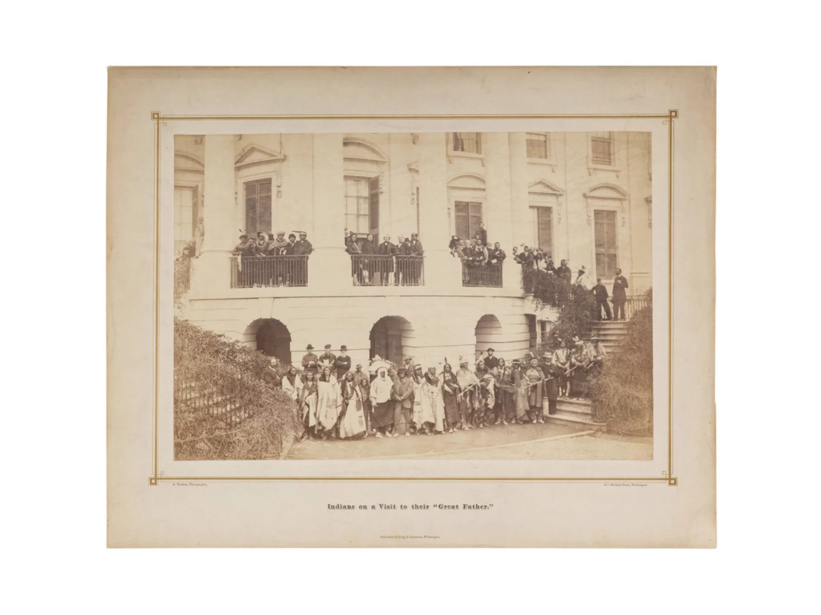 Among the many highlights is an exceptional selection of portraits of Native American treaty delegations visiting Washington, D.C., including a mammoth plate photograph by Alexander Gardner entitled Indians on Visit to Their "Great Father." Taken in February 1867, this image depicts a rare view of Sioux delegates standing below the balcony of the White House with President Andrew Johnson and his staff.
