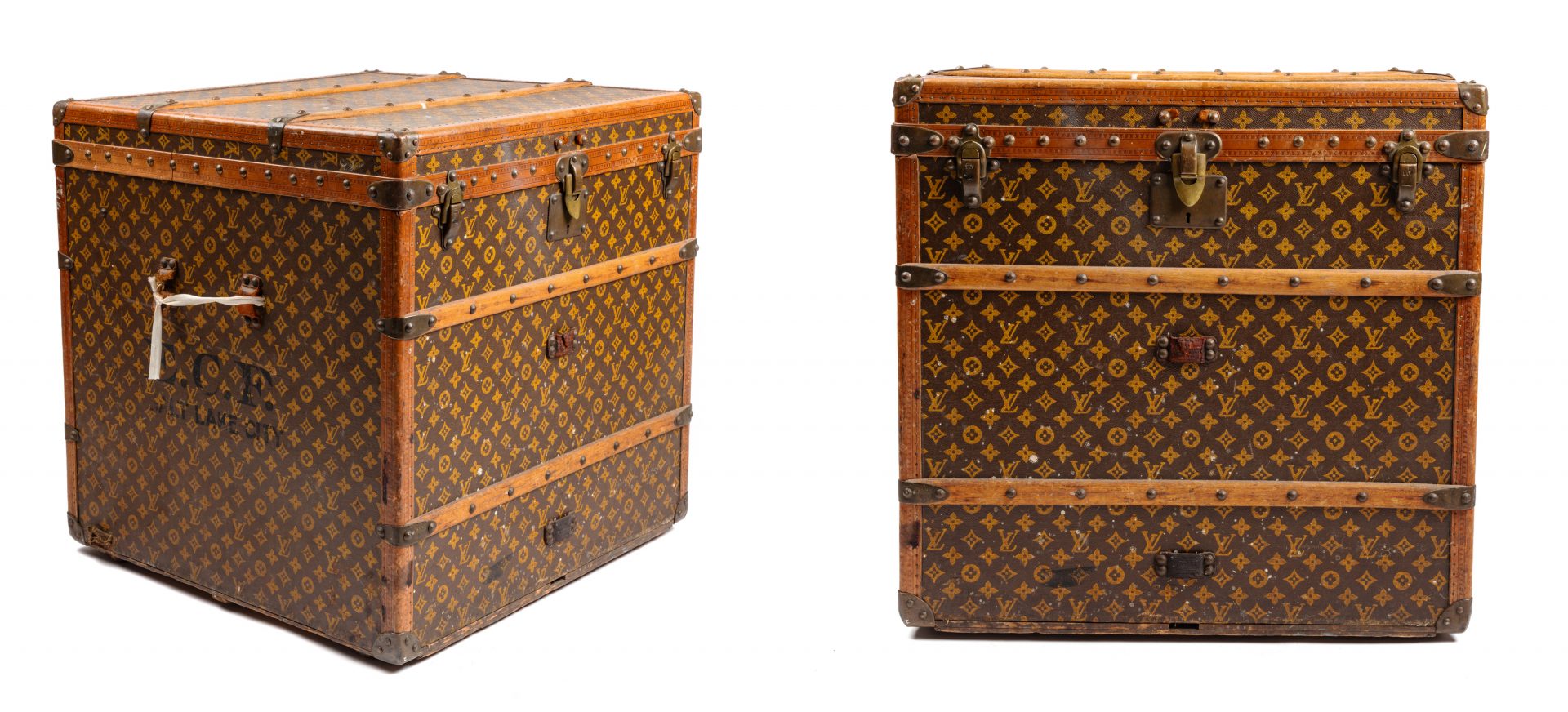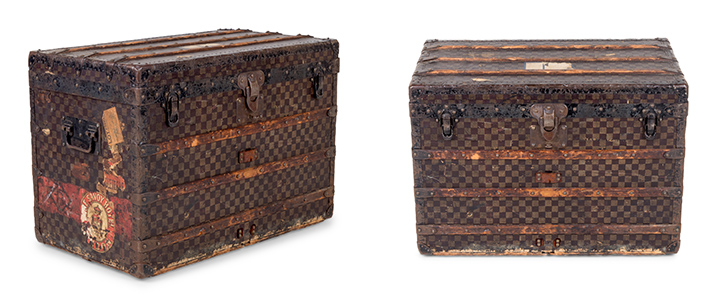 As recently as March 19, 2020 two Louis Vuitton steamer trunks, lots 280 and 281 in sale 740 Spring Fashion and Accessories, sold well over their high estimates at $4,000 and $5,750 respectively. With lot 280 featuring a damier print (Fig. 1) and 281 boasting Vuitton’s monogram logo (Fig. 2), it is easy to see both iterations of the shellac canvas still have a large audience, even if the trunk’s function has changed significantly in our modern day.