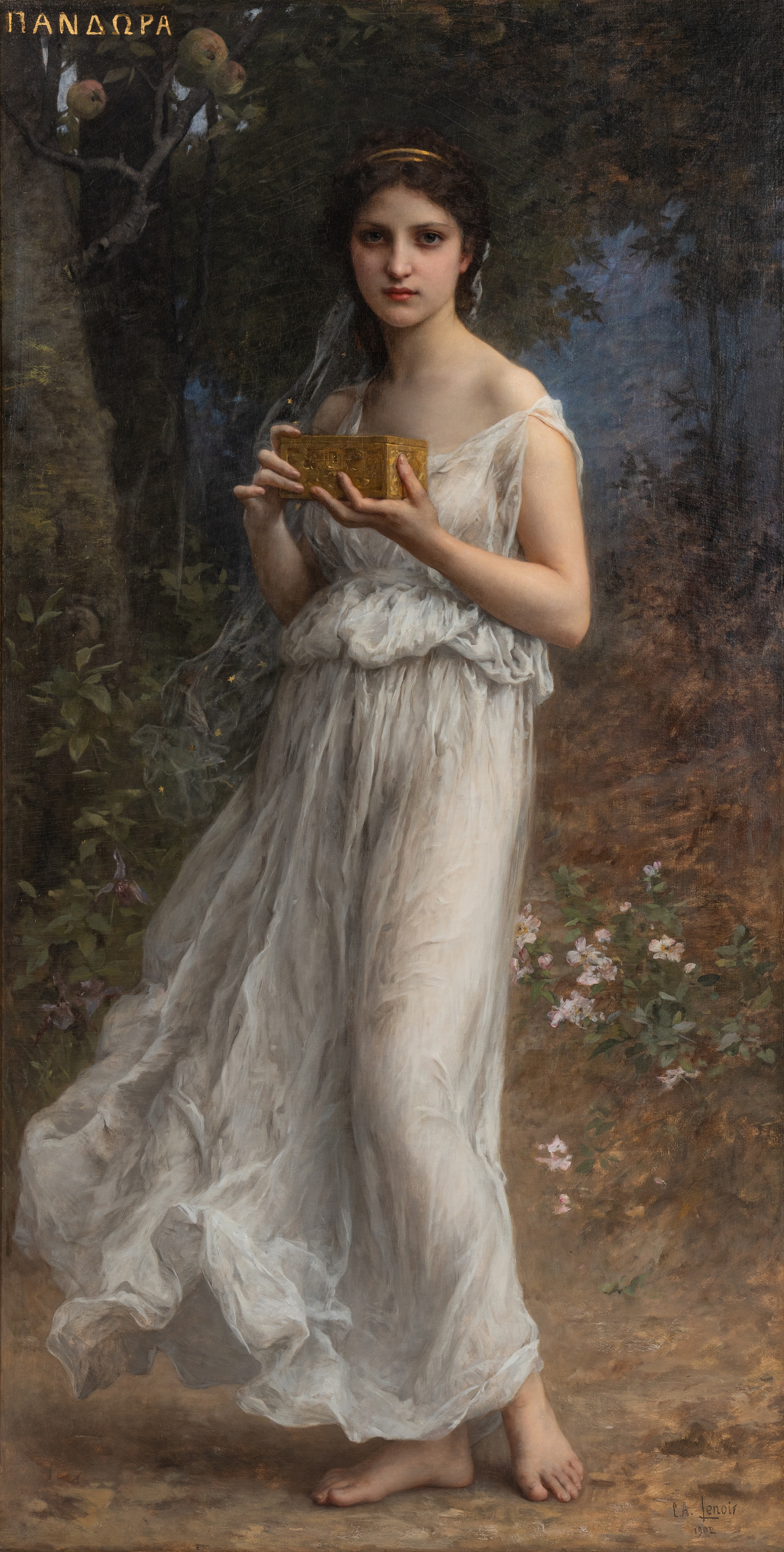 In Charles Amable Lenoir’s Pandora, 1902, the namesake subject solemnly gazes at the viewer as she delicately holds the gold box that contains all the world’s evils. Above her, an apple tree in full fruit can be seen, the symbol of Eve. Pandora’s porcelain skin and the smoothly painted surfaces throughout recall the teachings of William-Adolphe Bouguereau, with whom Lenoir studied at the Académie Julian, beginning in 1882. The son of a customs officer and a seamstress, Lenoir began his career not as an artist but as a teacher. He eventually saved enough money to pursue his true interest, to become an artist, and entered the École des Beaux Arts in Paris in 1881. His tenacity and talent eventually led him to win the Second Prix de Rome in 1889 for his painting, Jésus et le paralytique (Jesus and a Sick Man with Palsy), and then the First Prix de Rome the following year for Le Reniement de Saint Pierre (The Denial of St. Peter).