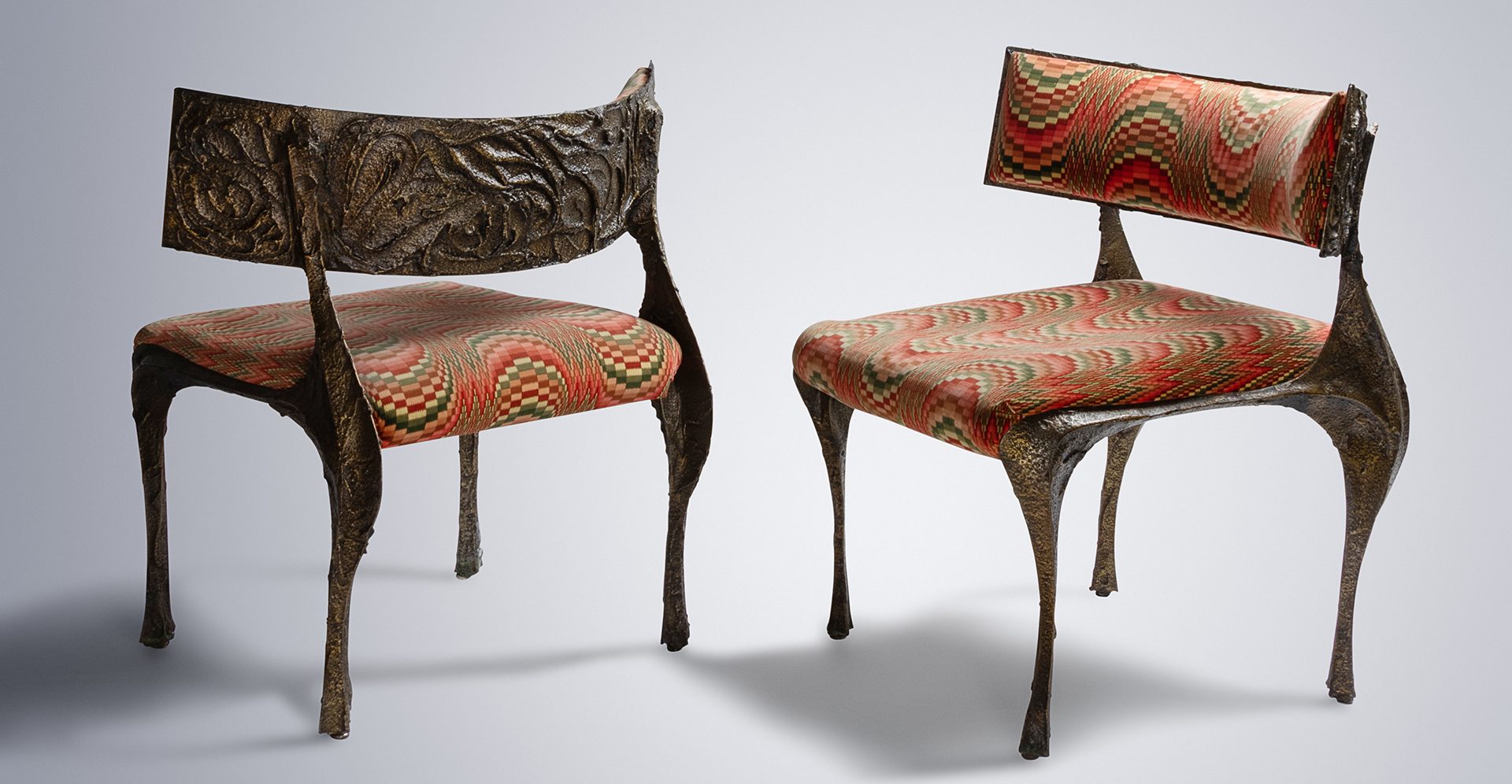 Figure 2: Hindman is excited to offer A Pair of ‘Sculptured Metal’ Lounge Chairs by Paul Evans in our upcoming May 19 Modern Design Auction. To achieve the ‘Sculptured Metal’ technique Paul Evans’ Studio used primarily for their work with Directional- first epoxy resin was applied over a steel frame, then the resin was sculpted in freehand form, sandblasted, and finally coated with atomized bronze.