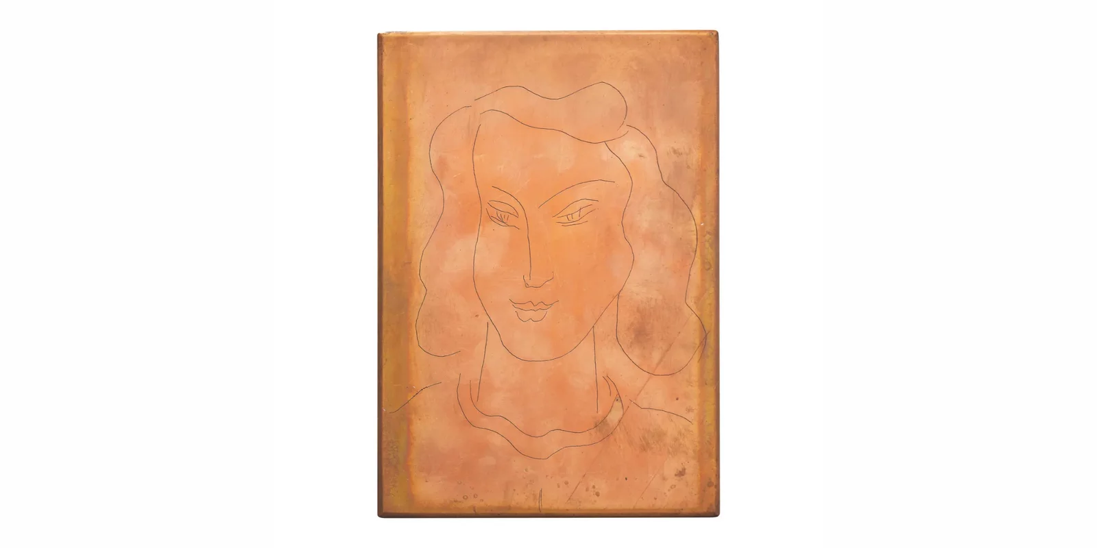 To create either a plate for etching or a lithographic stone involves making marks onto a prepared surface, fixing this image via chemical means, then inking and printing the resulting plate or stone. For etchings, a thin metal plate—most often copper, preferred for its softer qualities—is covered with a waxy, acid-resistant layer, the ground. Traditionally, a hard wax ground is used, such as for Lot 124, Matisse’s copper plate for Visage aux Yeux fixés vers le Sol (1946).
