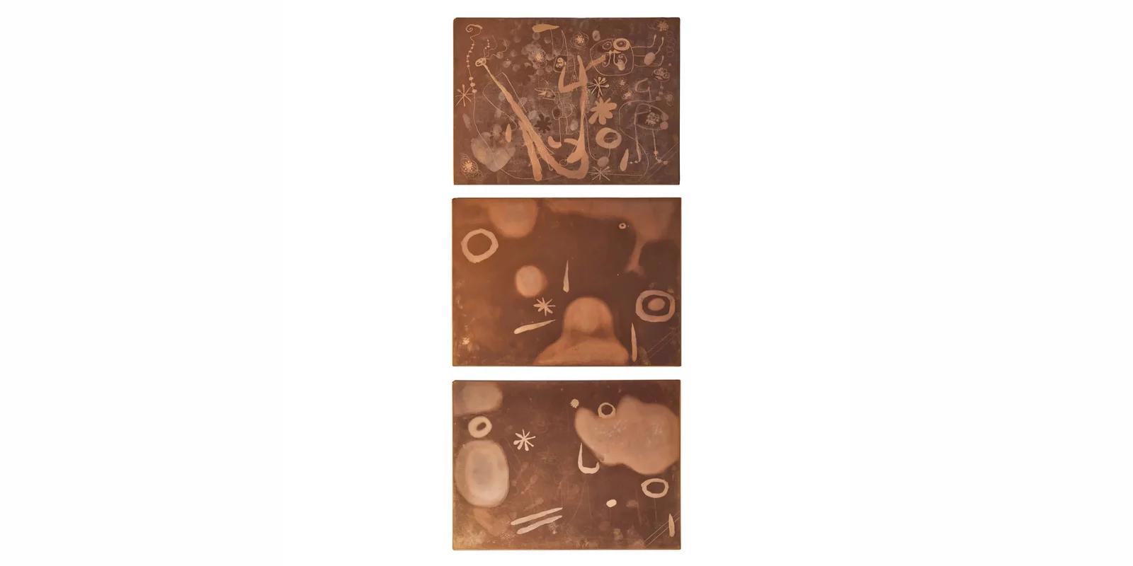 Soft-ground etching involves adding a fat such as tallow to the hard ground to make it more pliable. This process allows for a greater variation of marks and textures, as different materials can be used to mark the groundat varying pressures. For example, in Lot 125, one of the three copper plates used for Joan Miró’s etching, La Main (1947/53), the artist pressed his hand into the soft ground (see top plate below). In this example, you can see very clearly that a broad variation of etched marks can be produced with the softer, more workable ground.