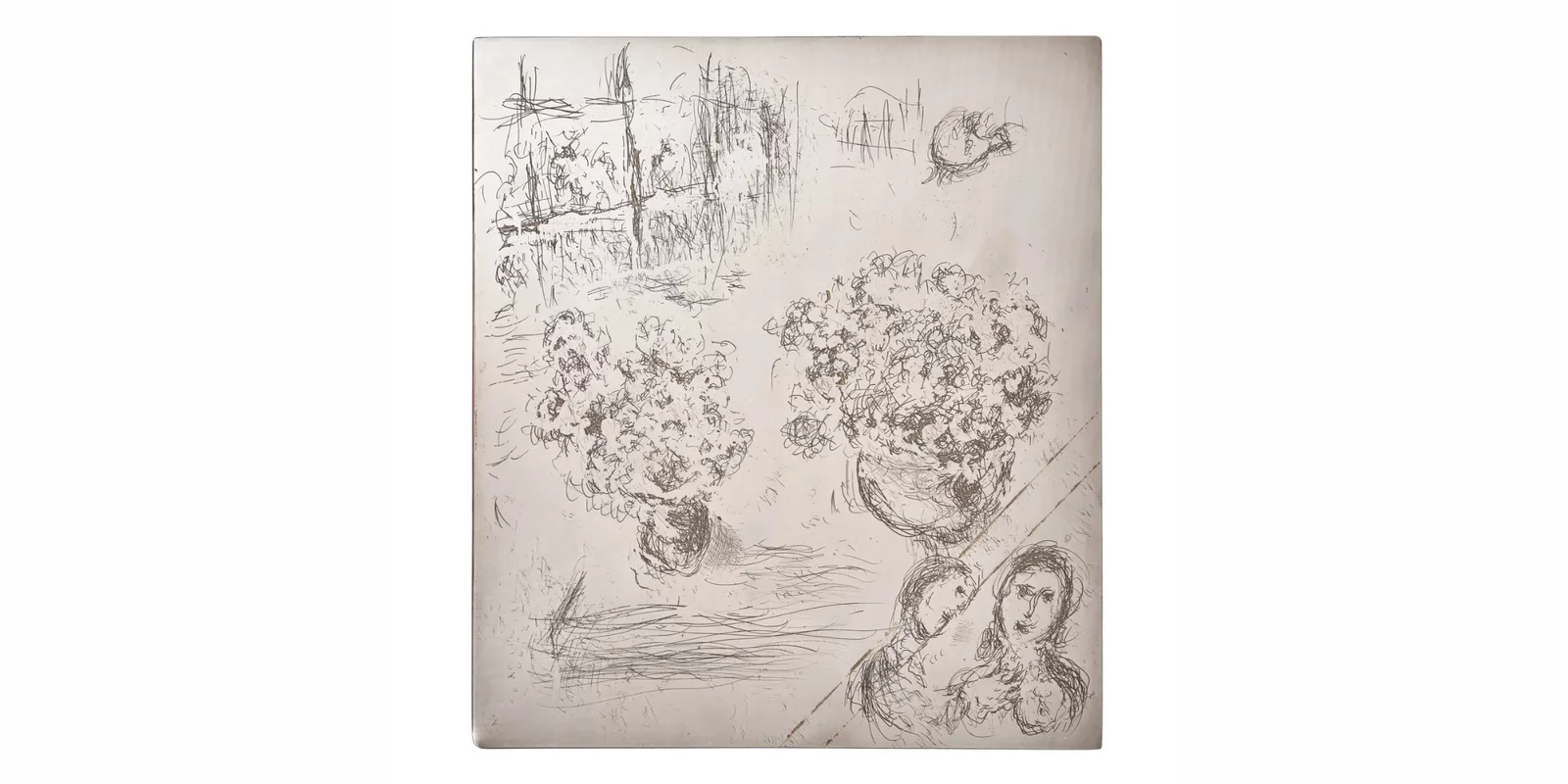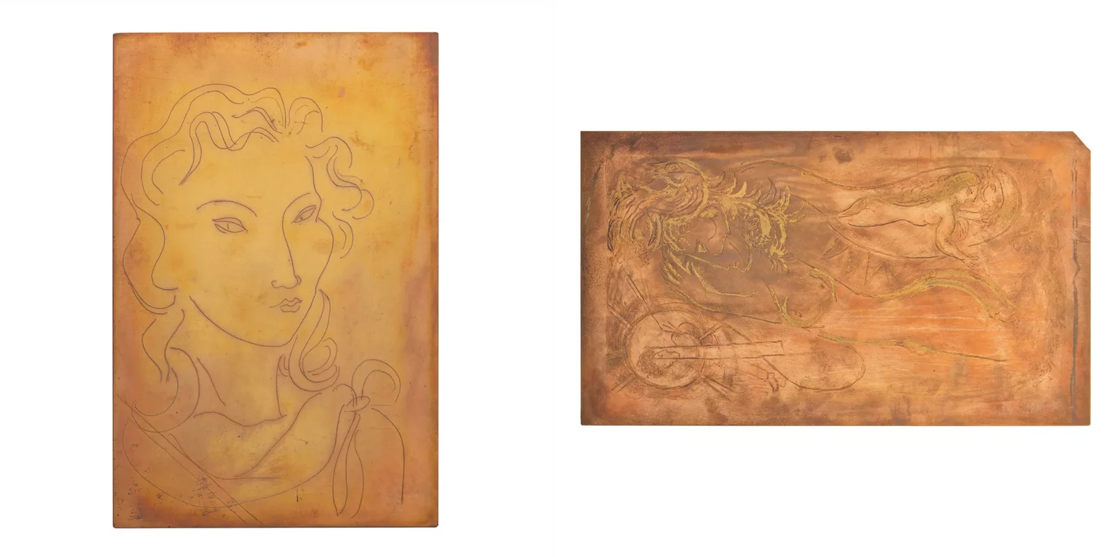 This collaborative process provides even greater potential to see the artist’s thought process. For example, included as Lot 122 in this collection is a Matisse copper plate meant for the 1932 publication Poésies but was ultimately not used in the edition. Another plate offered in this auction relates to Chagall’s work on the portfolio Un Poème dans chaque livre (1956), Lot 126, for which another variant of the composition was ultimately chosen for the edition. Plates such as these offer a glimpse into the artist’s vision and, as presented here, gives the collector access to a unique, unpublished work of art.