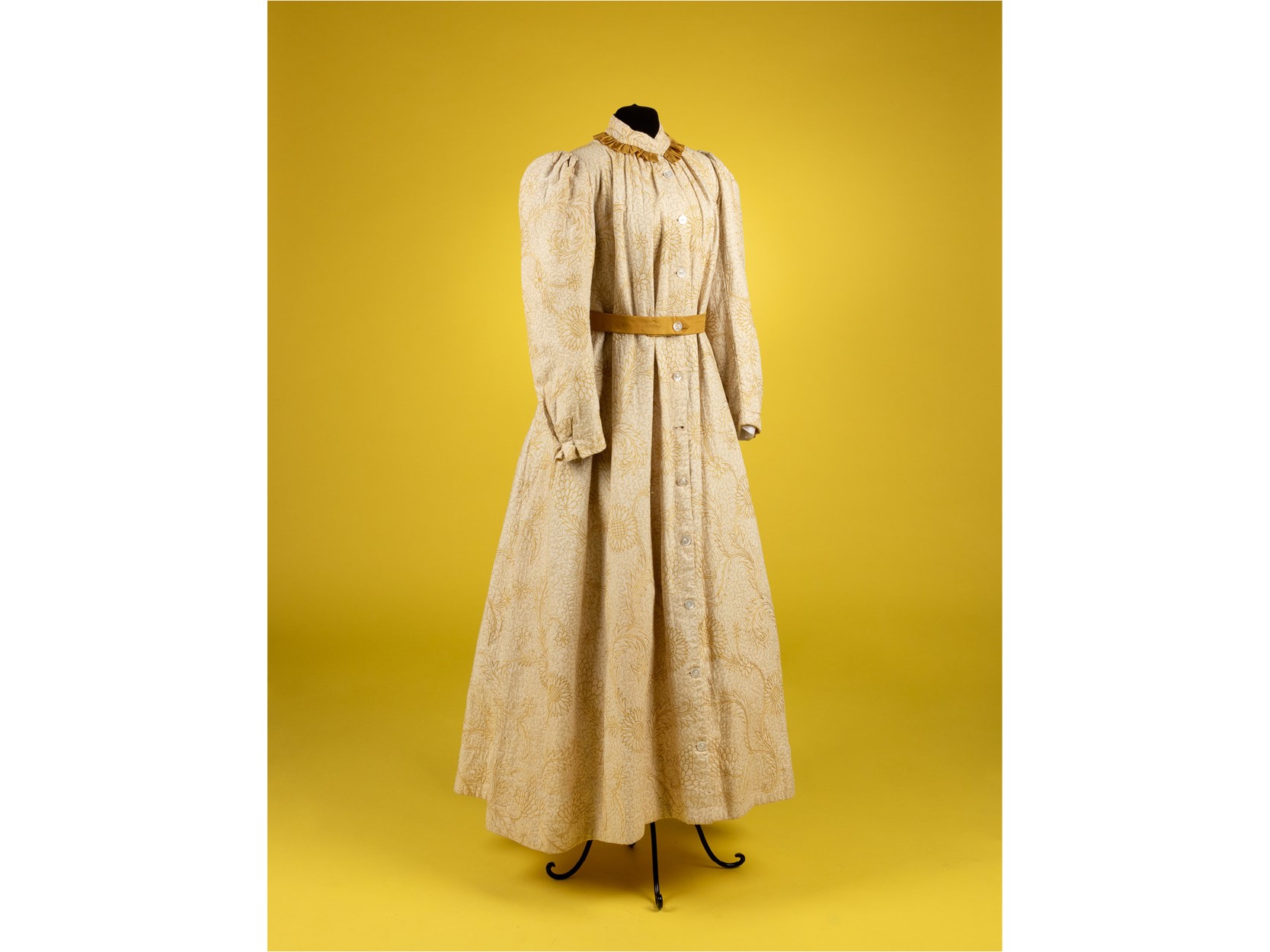 In this dress, the embroidered chain stitches create the ground of an intentionally anti-modern silhouette. A woman, wearing this garment to receive her guests for tea, would have fit the Aesthetic ideal, achieving harmony between dress and interior space. These yellow sunflowers in their chromatic decadence embody Wilde’s maxim that “beautiful surroundings” should not be “marred” by “gloomy dress.”[8] Hindman is thrilled to present lot 89 among three centuries of historical dress from the Mary D. Doering Archive in Luxe Holiday: A Collectors’ Collection on December 11th