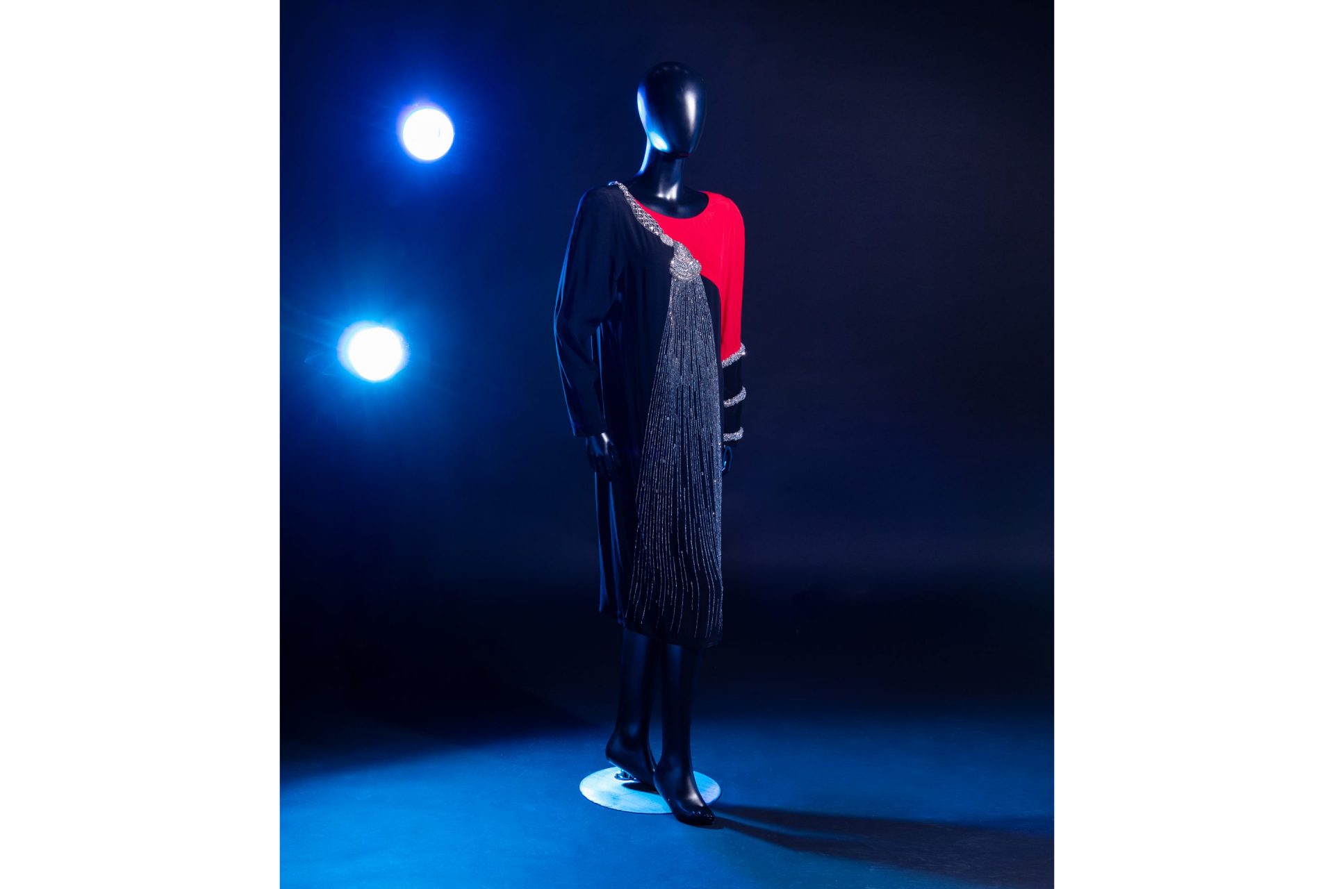 While at Chloé, Lagerfeld was prolific, producing some of his most playful and irreverent work. Such whimsy is prominent in Chloé’s 1983 autumn/winter collection where a parade of models strutted down the runway in garments displaying various plumbing fixtures as accessories to garments inspired by shower heads dripping dazzling crystals. The various iterations of the shower dress became signature pieces of this collection, with two later acquired by Eunice Johnson and the Ebony Fashion Fair (Fig. 1). The shower dress was featured in the 1983/84 Ebony Fashion Fair where Mrs. Johnson celebrated the piece as Lagerfeld’s “most outstanding creation”.