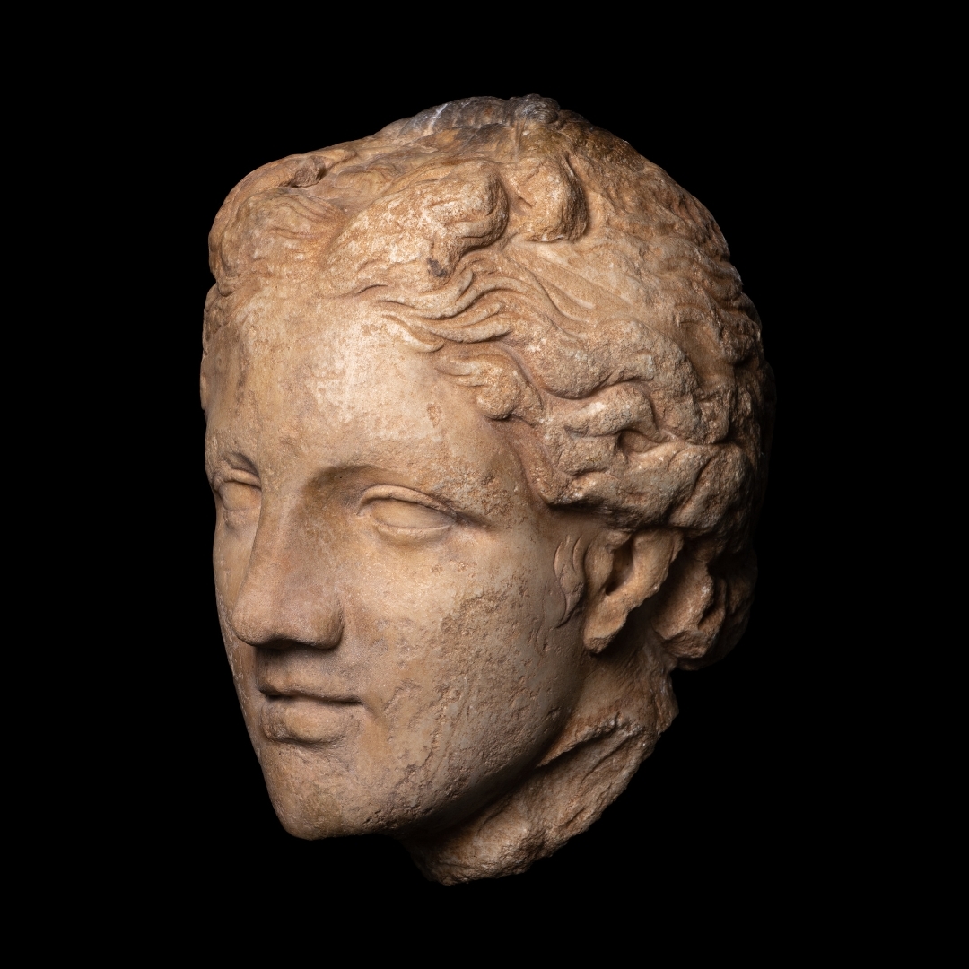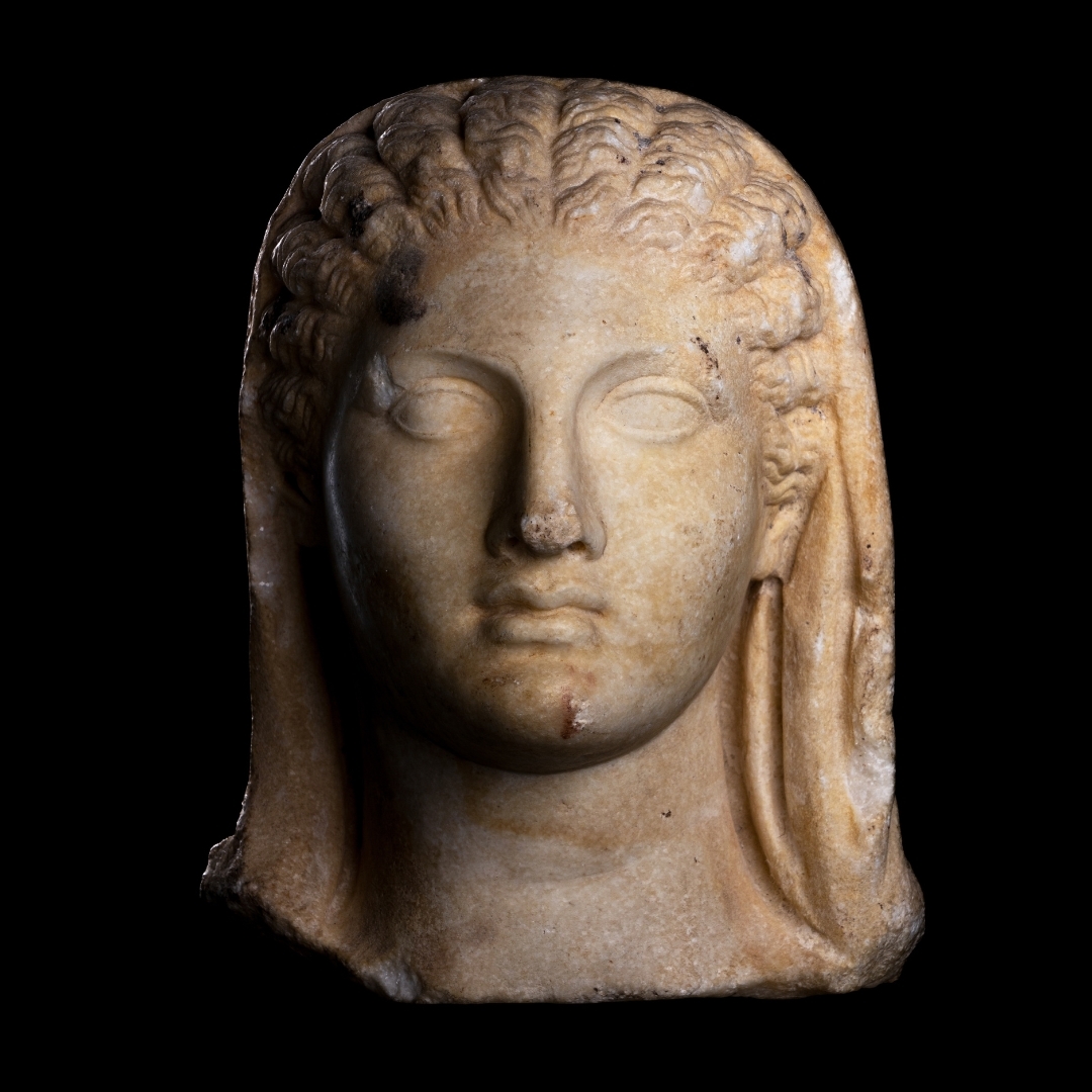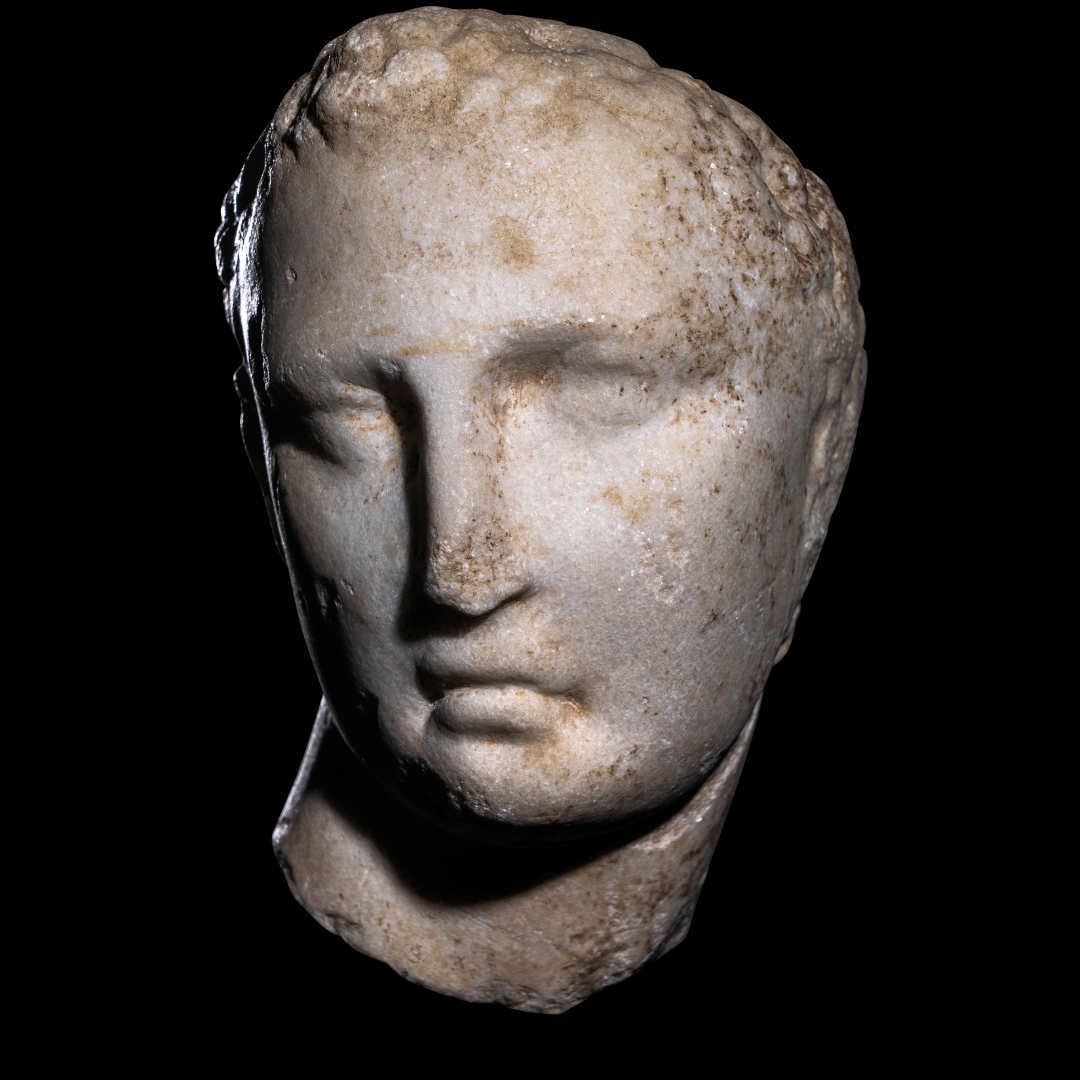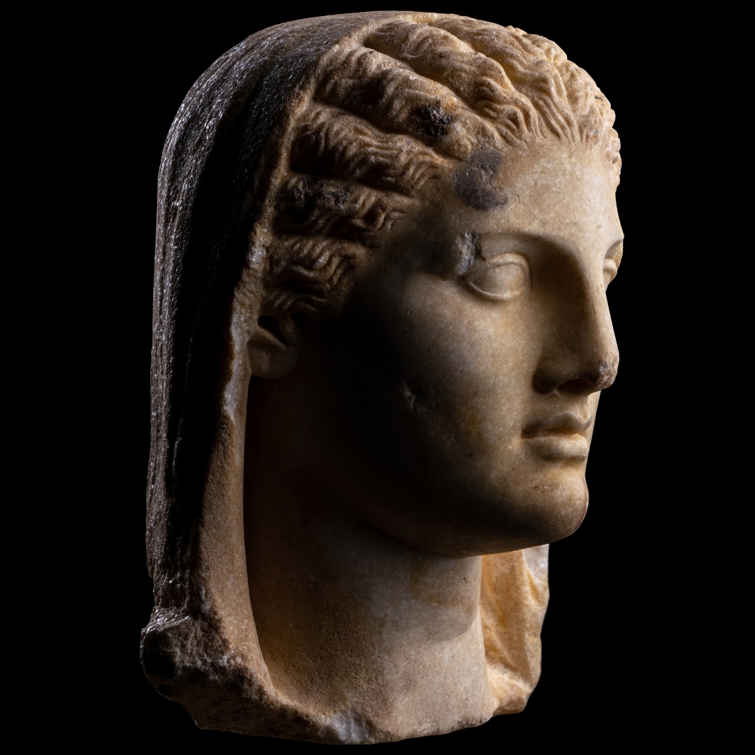 Showing the smooth countenance of a woman, this sculpted head is timeless by design. Once part of a life-sized statue, the voluminous folds of the woman’s mantle would have draped around her body and shoulders before being drawn up at the rear to partially cover her hair in a gesture signaling piety and modesty. The coiffure itself is an ornate configuration of curly strands rolled into rows, pulled back from the brow, and gathered behind in a chignon, creating a ribbed effect termed by scholars as the melonfrisur (‘melon-hairdo’). This distinctive hairstyle originated in Late Classical Greece, where it was deployed to great effect by the master sculptor Praxiteles. Elements of the facial structure, too, reflect this epoch: a somewhat low, triangular forehead, the sharply defined line of the brows descending to a straight nose, and the heavily lidded almond-shaped eyes.