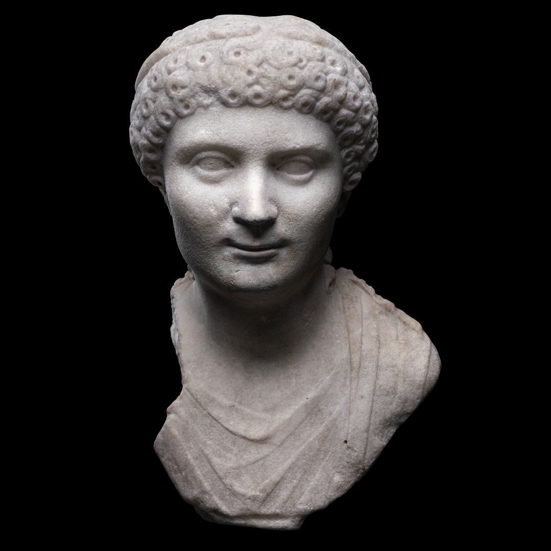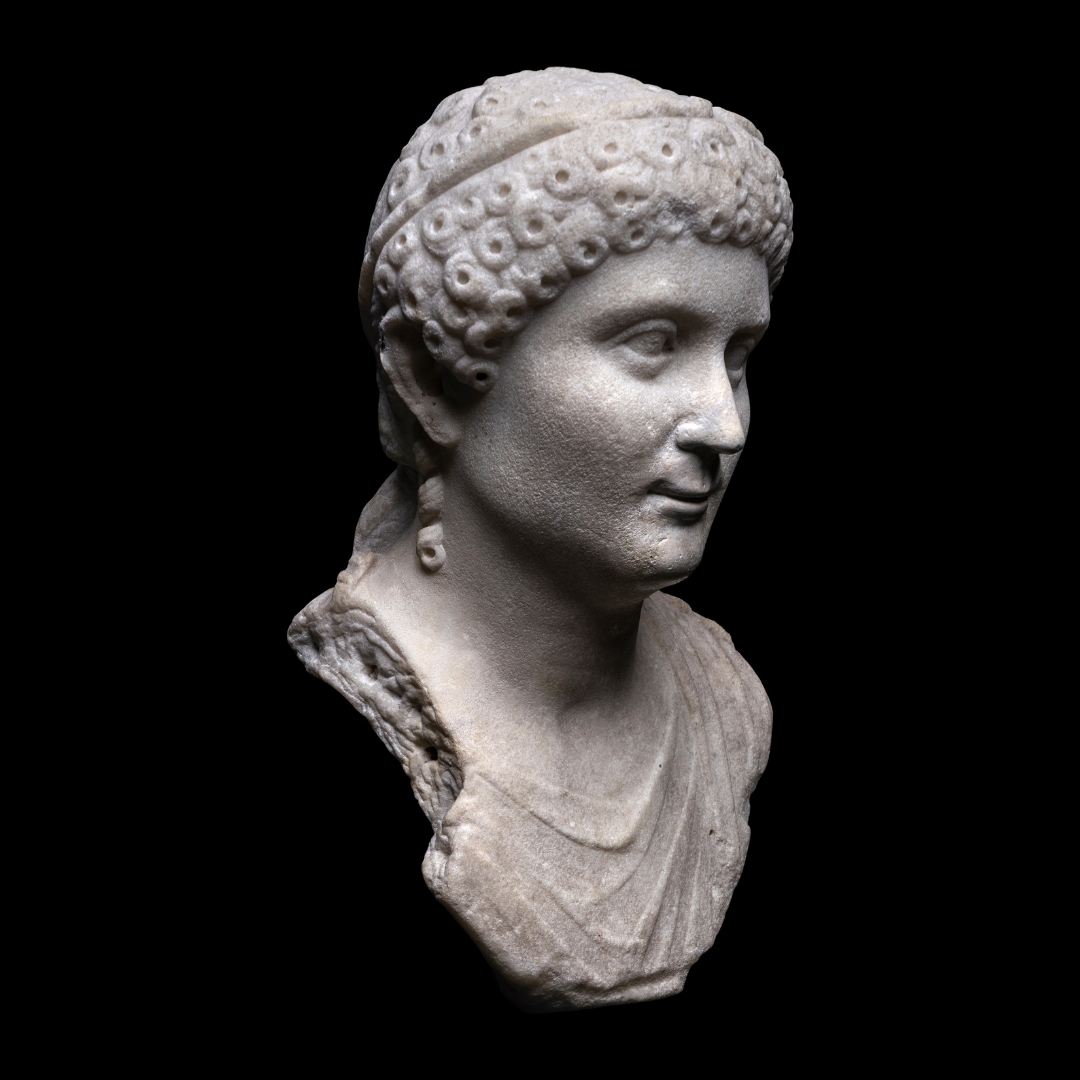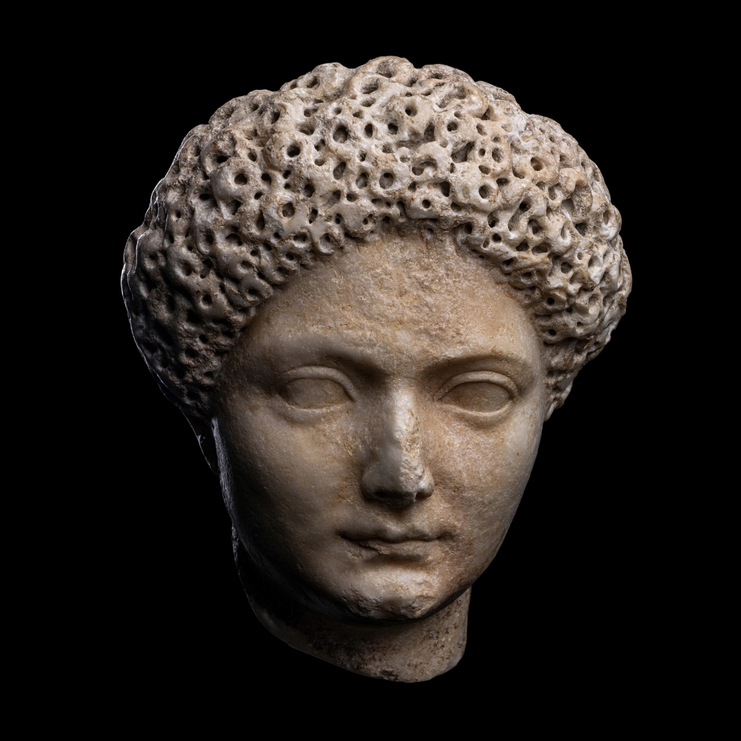 Julia Titi was a famous beauty, and her portraits are the most attractive of the Flavian women. Surviving portraits of the princess, such as this one, bear this out. Here, her features are idealized, with a delicate heart-shaped face, large almond-shaped eyes, full lips with pronounced ‘cupid’s bow’, and serene brow. The Flavian hairstyle pioneered by her mother - a halo of curls over the brow, with deep drilling - is most appealing here: elegant, flattering, and more restrained. At the rear, what would have been a voluminous braided bun is summarily rendered. This example has most in common with the best-known of Julia Titi’s portraits now in the Museo Nazionale delle Terme in Rome.