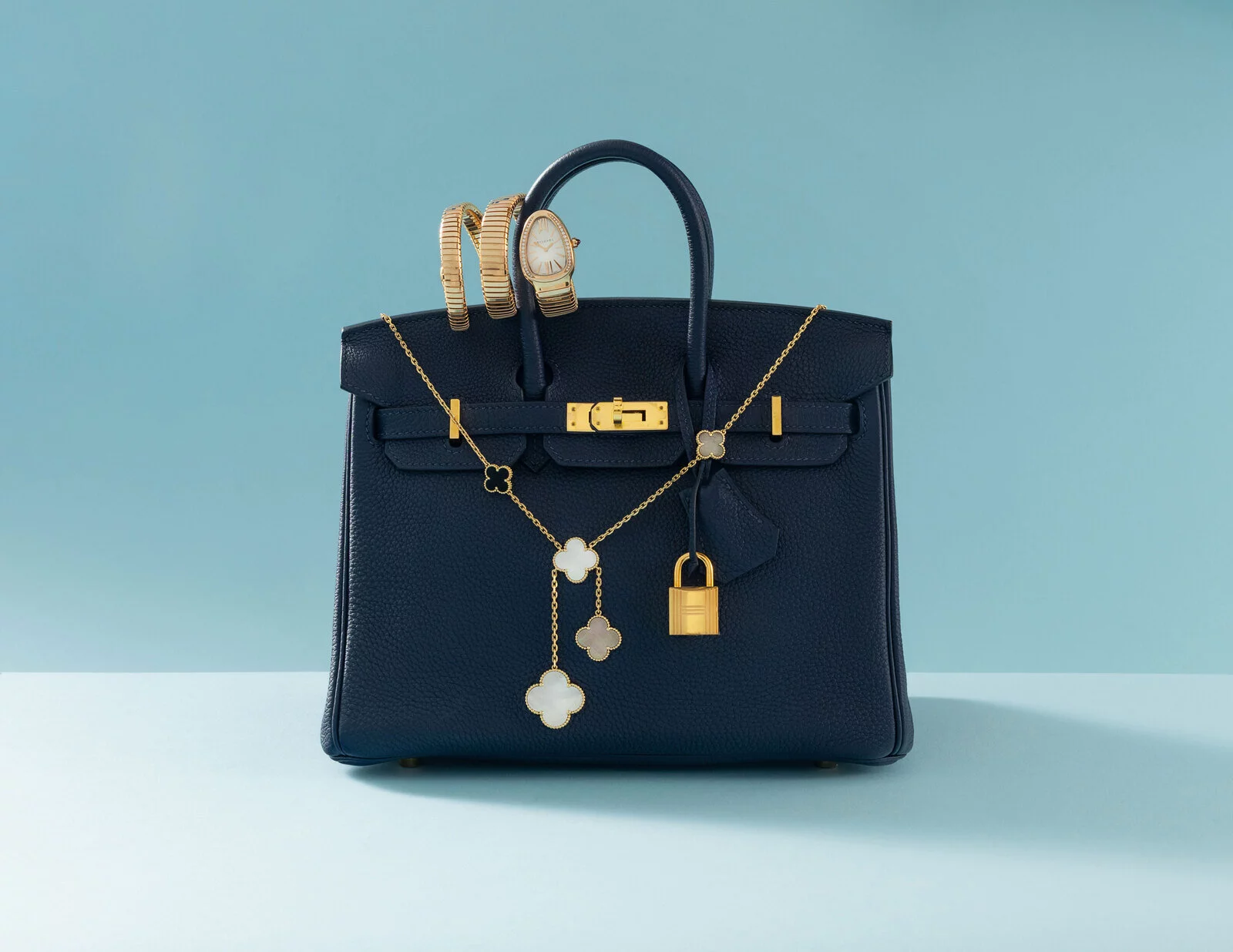 The jewelry selection is equally dynamic, ranging from celebrated luxury brands to exceptional watches. Highlights include Alhambra jewelry from Van Cleef & Arpels, a Hermès Birkin 25, a Bulgari Serpenti Tubogas Watch, and an important collection of bold, sporty Hublot watches, complemented by diamond and gemstone jewelry chosen for craftsmanship and fashion-forward designs. Each piece adds dimension and sparkle, functioning as both a statement and a personal signature.