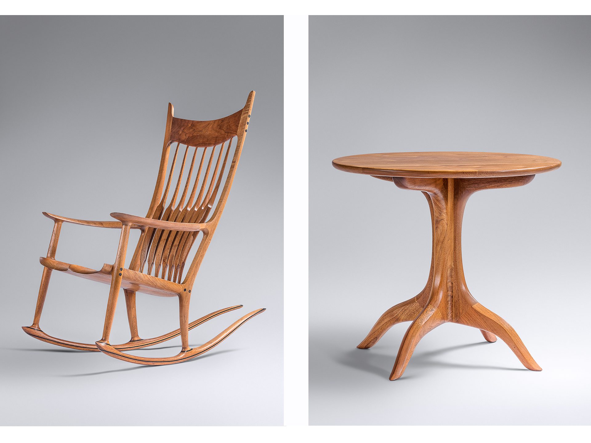 Left: Sam Maloof (1916-2009), Rocking Chair, 1993. Estimate: $20,000-$30,000. Right: Sam Maloof (1916-2009), Pedestal Table, 1993. Estimate: $4,000-$6,000.