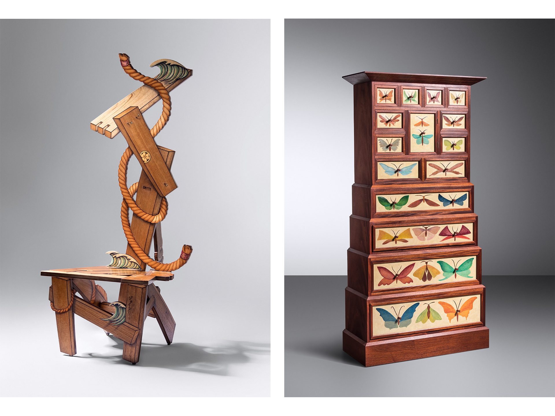 Left: John Cederquist (b. 1946), Little Waves Attempting the Rope Trick, 2004. Estimate: $8,000-$12,000. Right: Judy Kensley McKie (b. 1944), Butterfly Cabinet, 1993. Estimate: $2,000-$4,000.