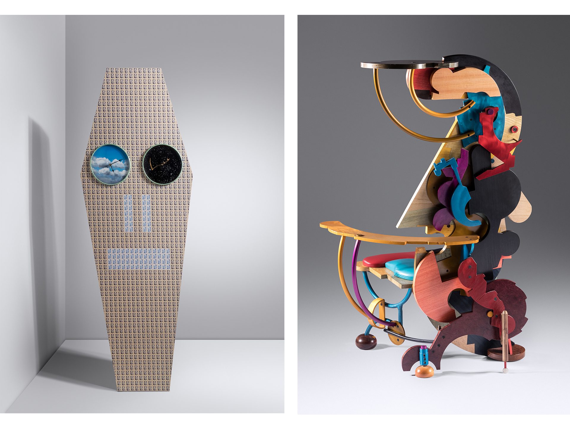 Left: Wendell Castle (American, 1932-2018), Vargo Clock, 1995. Estimate: $2,000-$4,000. Right: Wendell Castle (1932-2018), Three-Star Console Table, 1996. Estimate: $8,000-$12,000.