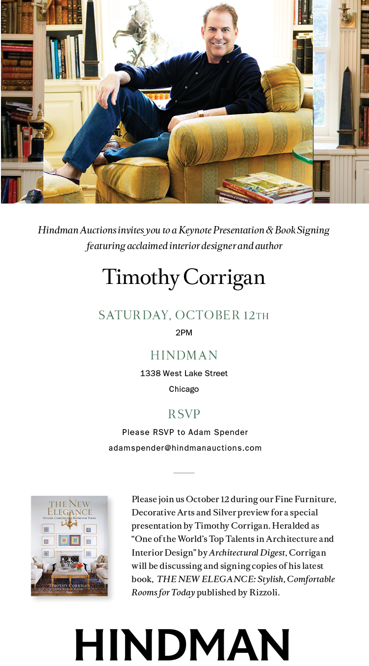 “We are excited to have Timothy Corrigan as our guest during our auction preview. We have admired his work for years, both his approach to design and his restoration work on numerous landmark houses. He is a true champion of the decorative arts!” – Corbin Horn, Senior Specialist and Director of Fine Furniture, Decorative Arts and Silver