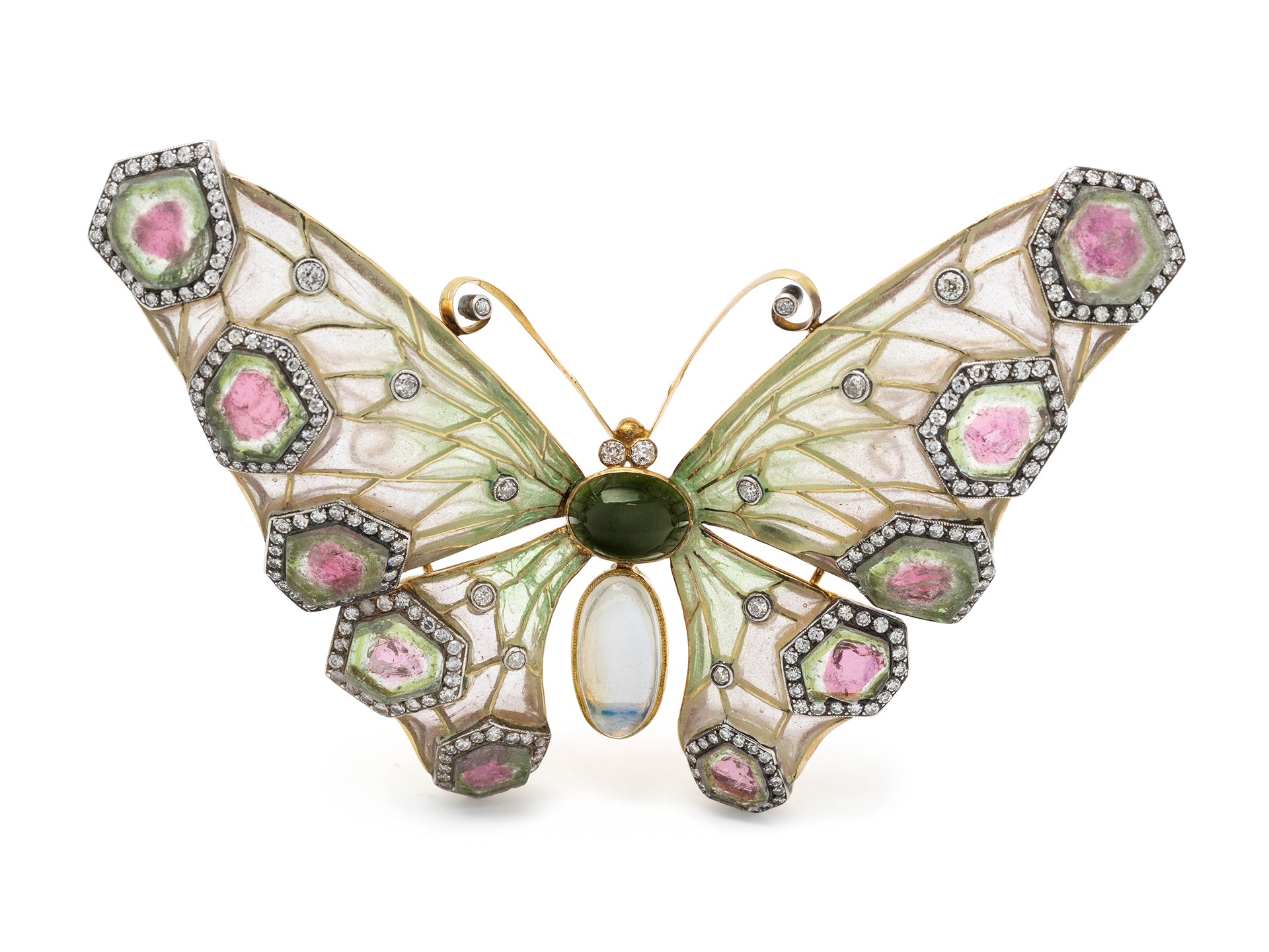 Lot 78 | EVELYN CLOTHIER, PLIQUE-À-JOUR ENAMEL, MULTIGEM AND DIAMOND BUTTERFLY BROOCH | Estimate: $5,000 – $7,000