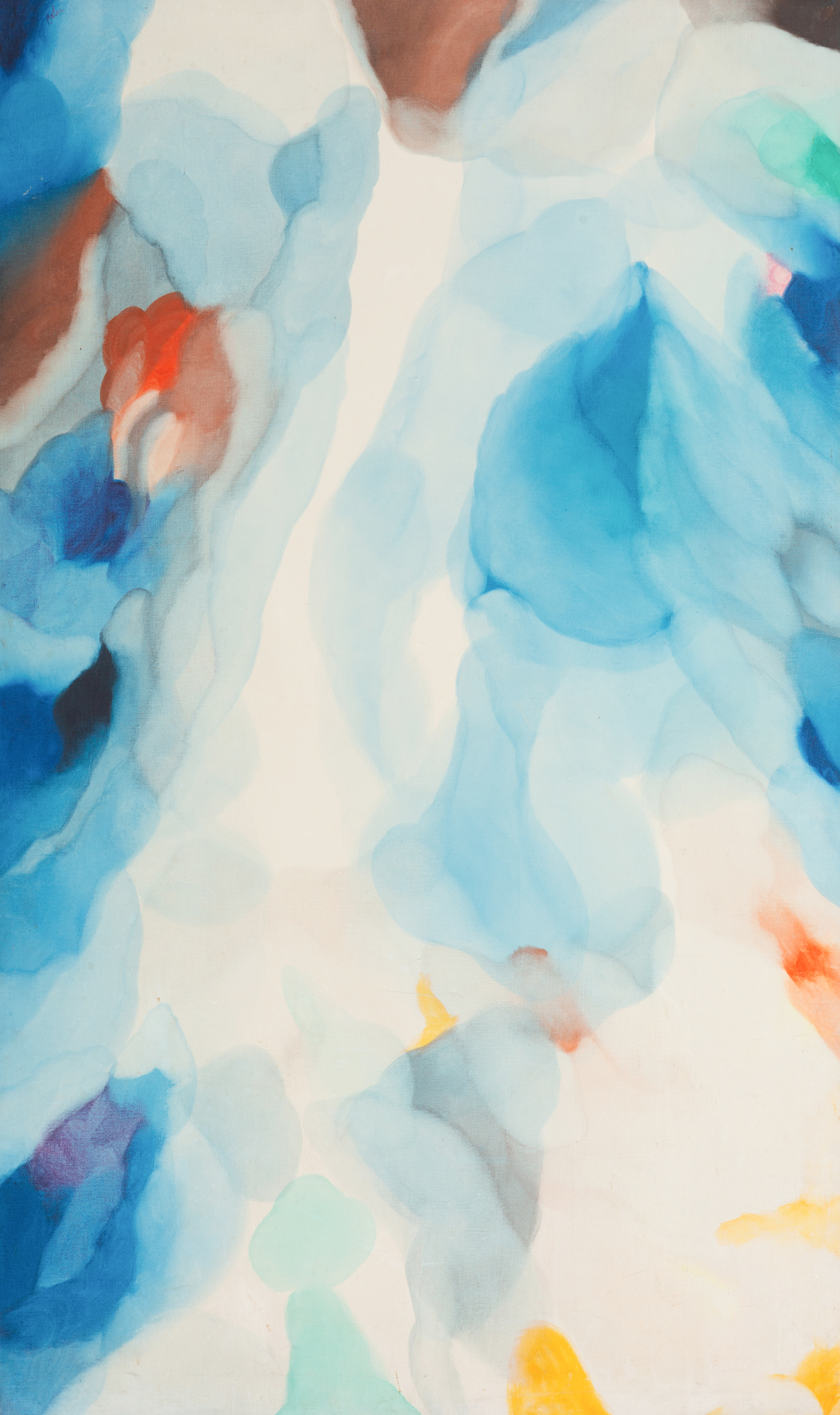 Baber’s 1973 Dance of the Wind Cave (lot 59) is a beautifully fluid acrylic on canvas that perfectly captures her tendency to satisfy what she termed “color hunger.” She had a strong desire to use and understand color in ways that were both concrete and atmospheric throughout her work. Dance of the Wind Cave is also archetypical of those she made during the prime of her career – there is a balance of positive and negative space, with shifting forms of color that have a kaleidoscope-like quality.