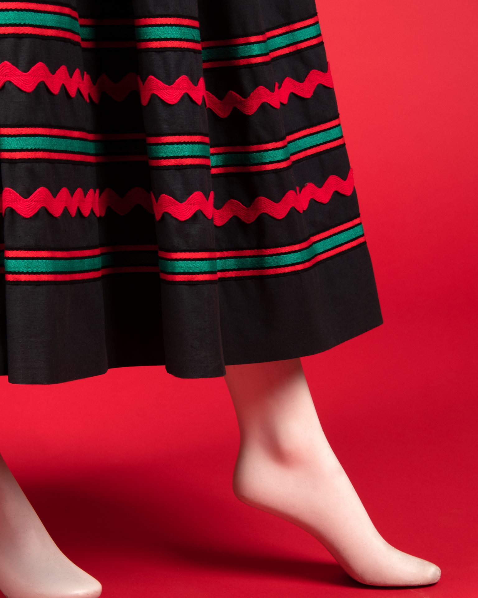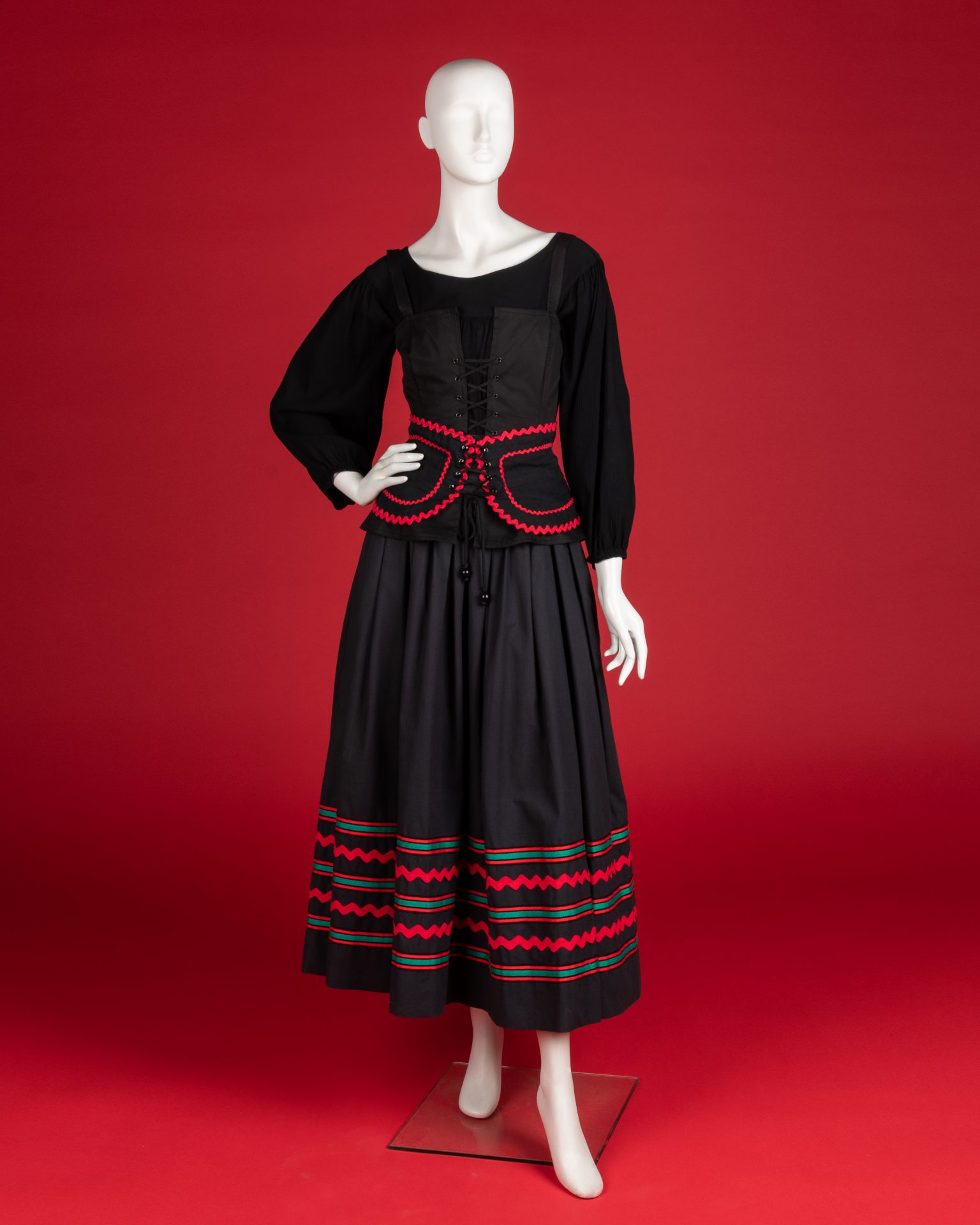 From the collection of Martha Smith Simpson, lot 8 is a rare example of a complete ensemble from Yves Saint Laurent’s 1976 Peasant Rive Gauche collection. Featuring a crepe blouse, laced corselet, a belt and a skirt embellished and trimmed with red and green rickrack, it captures the intoxicating appeal of this moment in fashion. Billowing sleeves, long skirts and eclectic details are laced and cinched at the waist, feminine and romantic.