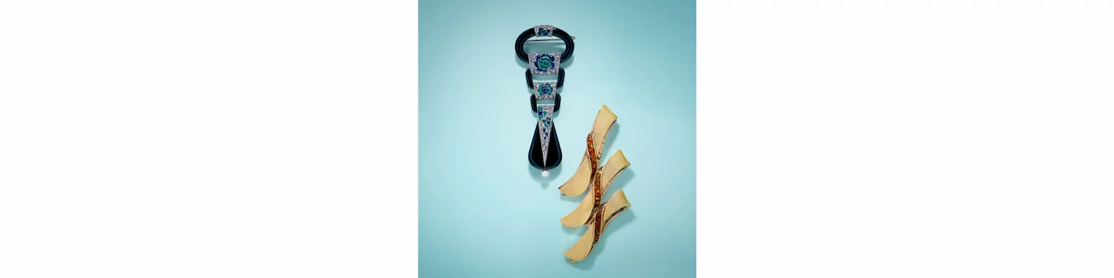 From Left to Right: Lot 29 | VERGER FRÈRES FOR LACLOCHE FRÈRES, ART DECO, ONYX AND MULTIGEM LAPEL WATCH | Estimate: $15,000 - 25,000