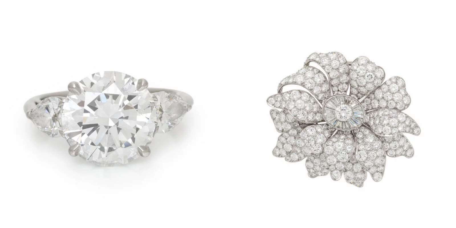 From Left to Right: TIFFANY & CO., DIAMOND AND PLATINUM RING | Sold for $140,800 VAN CLEEF & ARPELS, DIAMOND AND PLATINUM FLOWER BROOCH | Sold for $83,200