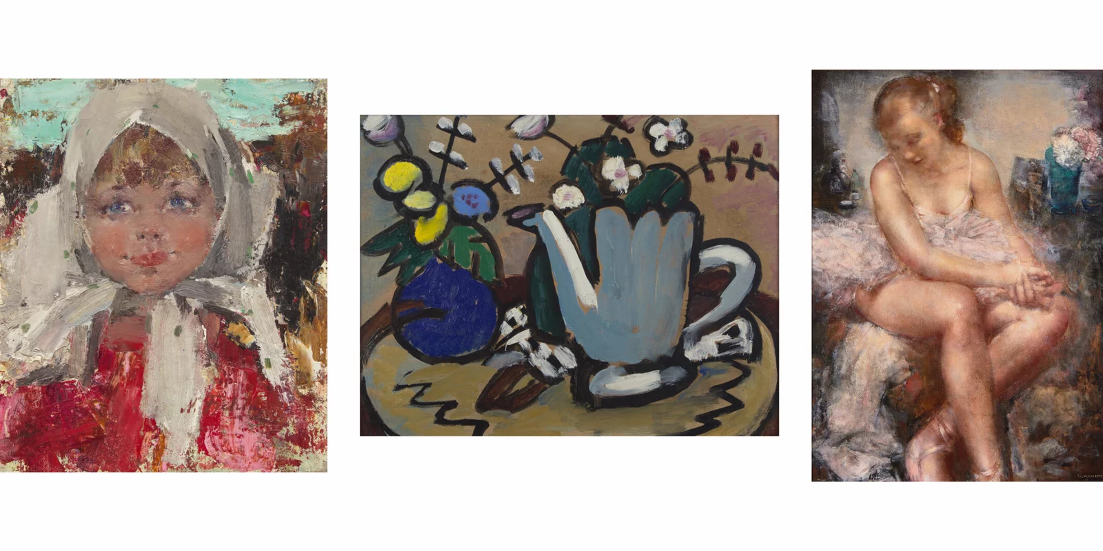 The April 29 sale also includes a broad selection of works tracing modern art across Europe and America. Highlights include Young Girl with White Headscarf by Nicolai Fechin (Lot 45), which blends Russian academic training with expressive, impressionistic brushwork, and Gluckmann's dancer compositions (Lot 9, Lot 10), which offer a quieter counterpoint to the theatricality of Edgar Degas. Two works by Basil Marros (Lot 40, Lot 49), an underappreciated Greek Modernist influenced by Fernand Léger will also take center stage. Also featured is Still Life with Gray Teakettle (1935) by Gabriele Münter (Lot 44), which draws on influences from Henri Matisse and Vincent van Gogh into a bold, personal visual language. The sale spans a wide cross-section of Impressionist and Modern work.