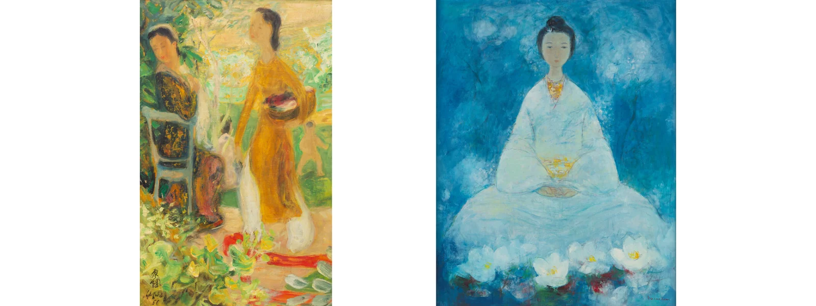 From left to right: Lot 51 | Le Pho (French/Vietnamese, 1907-2001) La Promenade, 1956 | Lot 85 | Vu Cao Dam (French/Vietnamese, 1908-2000) Divinité Blanche, 1976