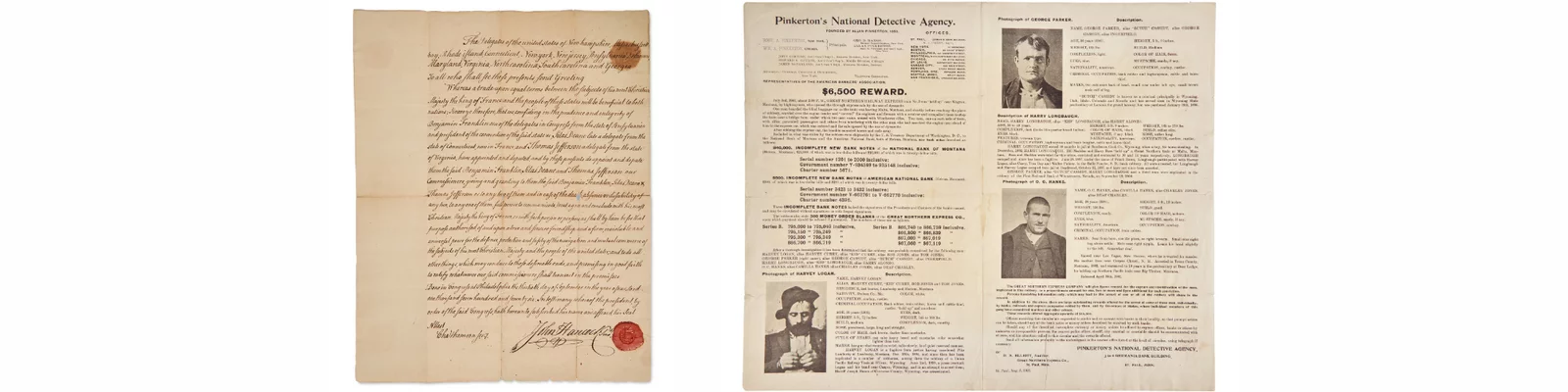 This very rare Pinkerton’s National Detective Agency wanted circular, issued August 5, 1901, documents the final train robbery carried out by the notorious Wild Bunch and stands as a compelling relic of the closing chapter of the American frontier. Circulated after the bold daylight holdup of the Great Northern Railway Express near Wagner, Montana, on July 3, 1901, the poster names Butch Cassidy, the Sundance Kid, Kid Curry, and Deaf Charley, offering rewards totaling up to $6,500 for their capture. It recounts the dynamite-assisted robbery in which more than $40,000 was stolen and includes photographic images, aliases, and detailed descriptions of the outlaws, reflecting Pinkerton’s central role in pursuing the gang. As the last known heist executed by the Wild Bunch as a unified group before their dispersal and demise, the circular holds exceptional historical resonance; only one other example is known to have appeared at auction, underscoring its rarity and importance.