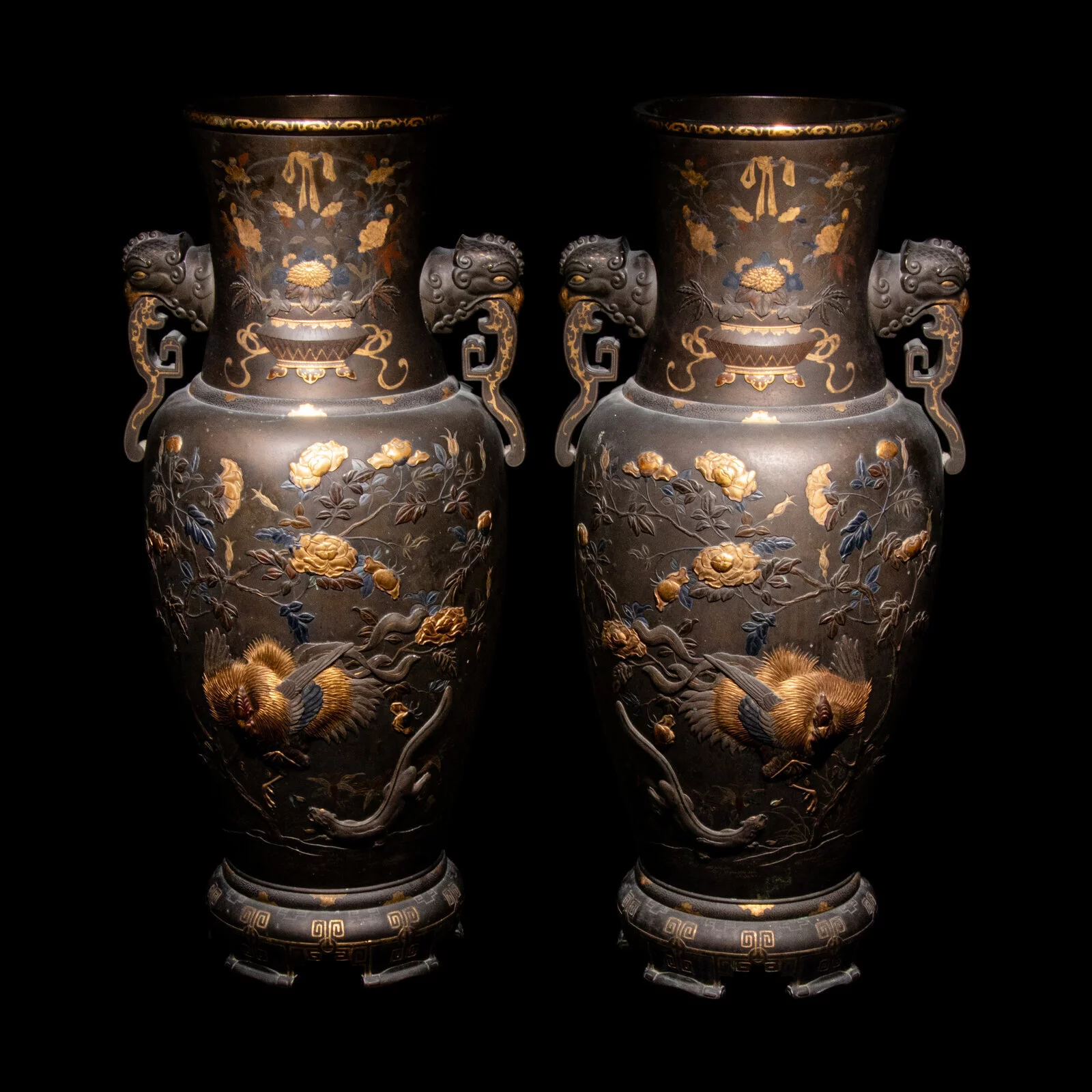 A Pair of Japanese Bronze and Mixed-Metal Baluster Vases, Meiji Period, Late 19th Century | Sold for $54,400