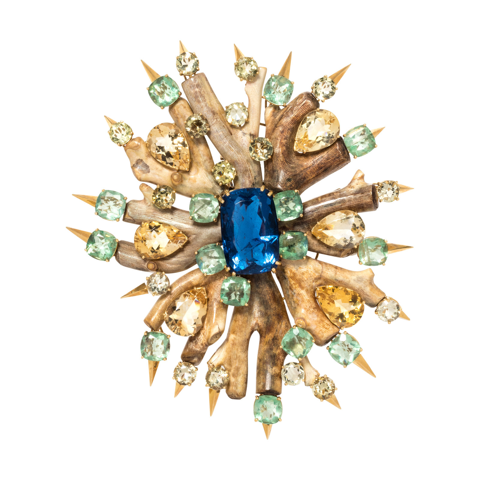 Tony Duquette, multigem and coral brooch; price realized: $23,750