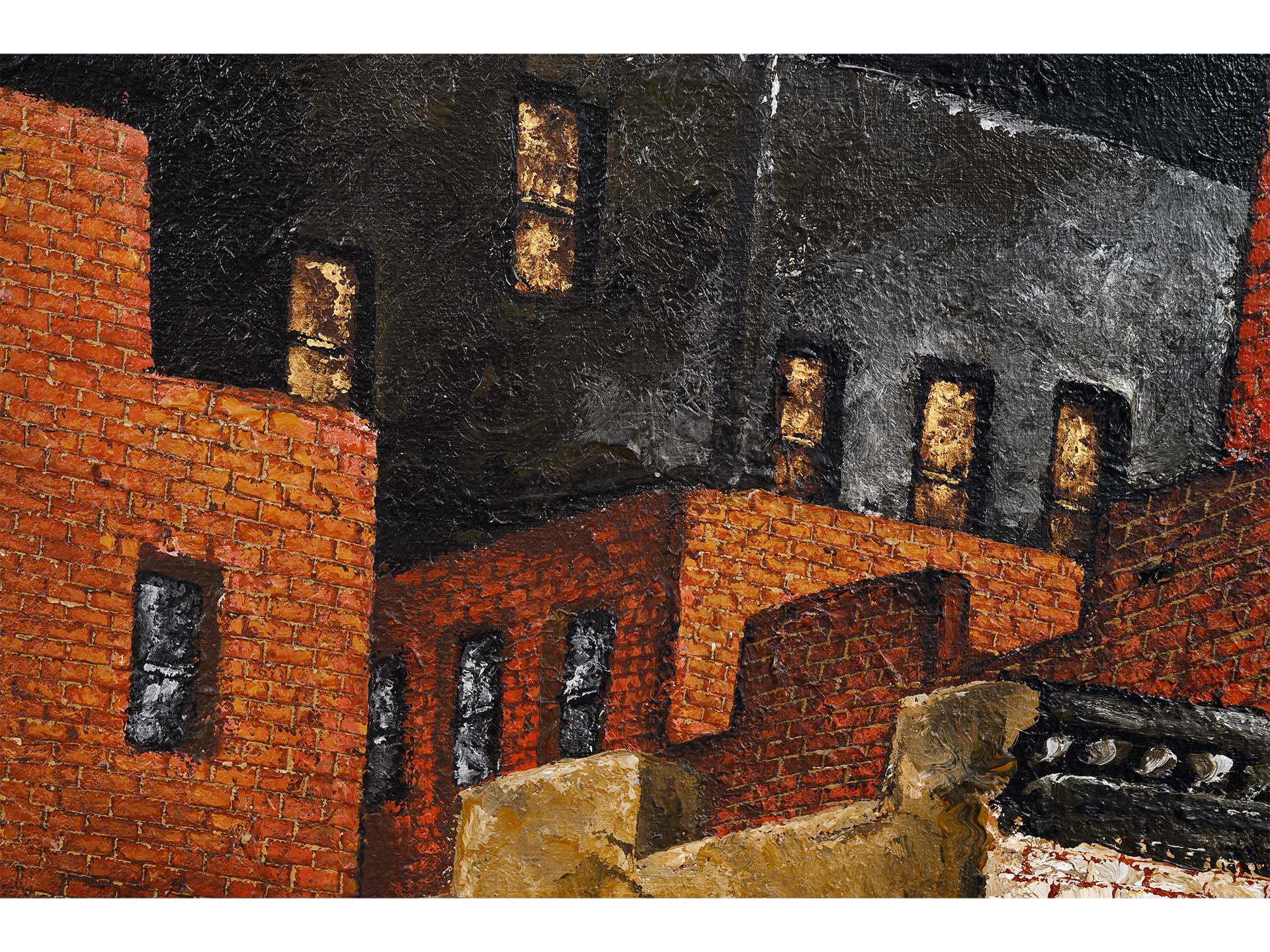 Wong is recognized for his merging of social realism and visionary art styles, as well as considering themes such as ethnic and racial identities. He became known for documenting New York City in his works. This piece captures the city in the gritty 1980s and the way in which urban life can feel imposing, particularly for the underrepresented.
