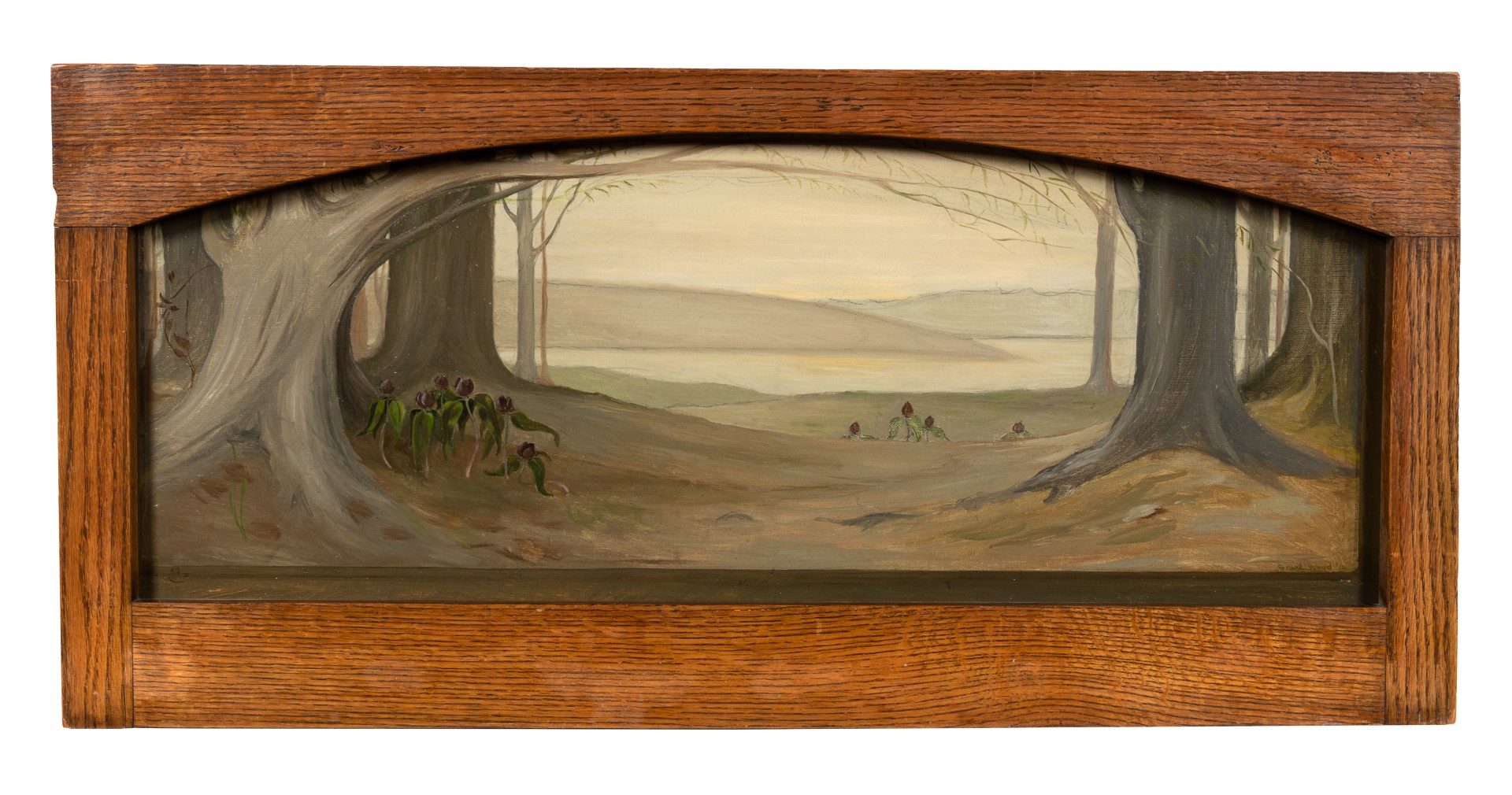 The auction features important works by native Iowans from the Cedar Rapids, Iowa estate of Nancy Holmes, including Marvin Cone’s oil on canvas, Interval (Cloud Painting) which was acquired directly from the artist and holds a presale estimate of $60,000-80,000. Additionally, two landscapes by Grant Wood come from this same collection, Decorative Landscape with Crocuses from 1912 and Reflections, Ville d’Avray from 1920. They are expected to sell between $30,000-50,000 and $15,000-25,000, respectively.