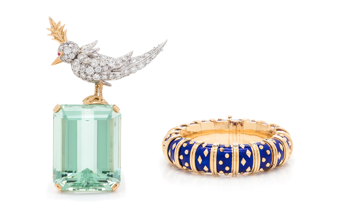 Of particular note, is a lovely group of Schlumberger for Tiffany & Co. jewelry that includes some of Jean Schlumberger’s most iconic designs. Among the highlights is a ‘Dot Losange’ bangle bracelet estimated at $15,000-20,000. This beautiful paillonné enamel design became known as the “Jackie Bracelet” as it was a favorite accessory of then first lady, Jackie Kennedy. Also included is a Green Beryl and Diamond ‘Bird on a Rock’ Brooch. Schlumberger’s ‘Bird on a Rock’ brooch is one of his most iconic designs and is estimated at $15,000-20,000. It was first created in 1956 and has been made in several iterations with various large ‘rocks’ of different gem varieties.