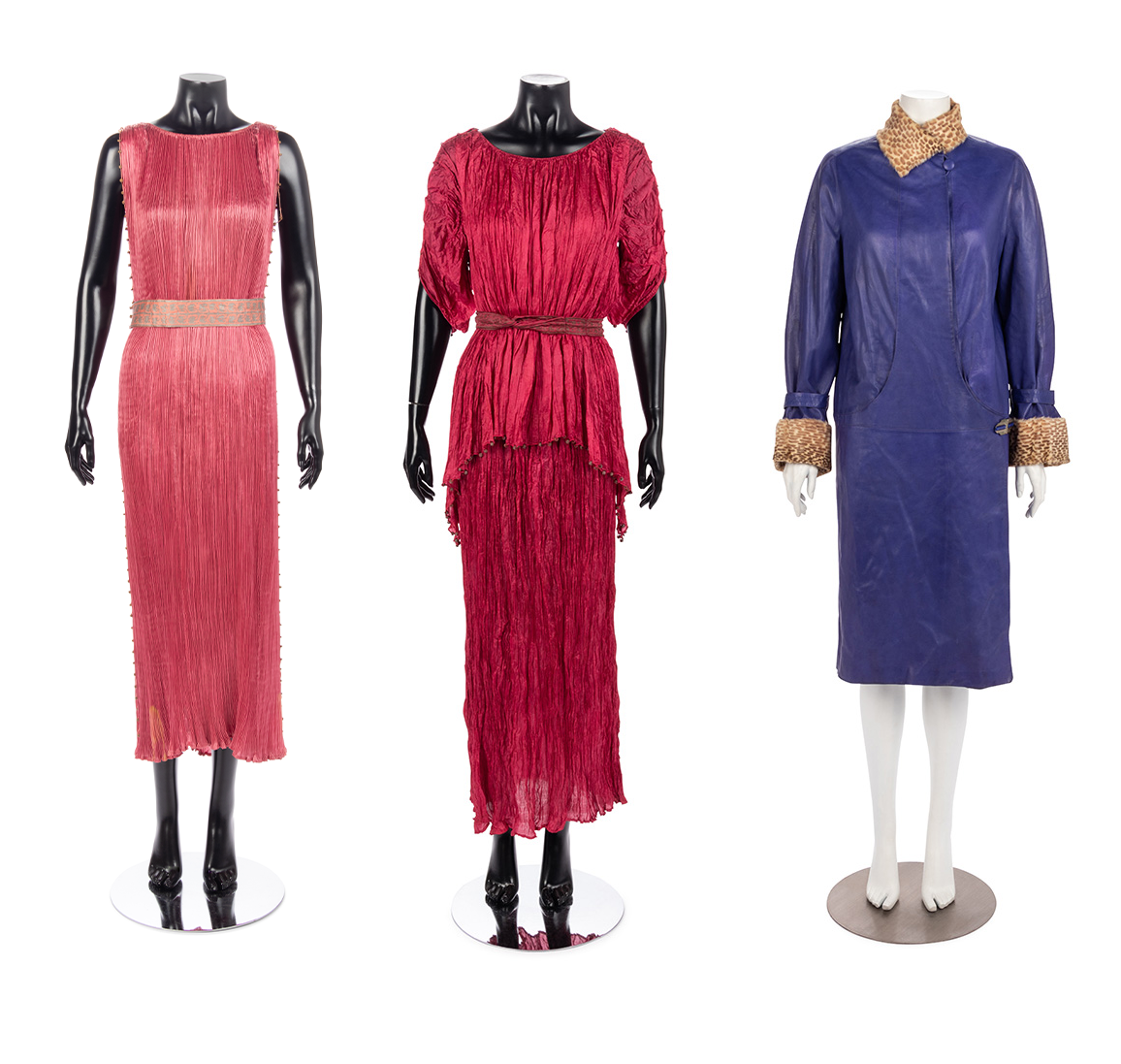 The oldest clothing items in this auction were made by Mariano Fortuny (1871-1949) in the early twentieth century and include the designer’s famous “Delphos” (Lot 5) and “Peplos” (Lot 6) dresses in fine pleated silk. From 1927 comes another rare example of fashion history in a purple leather coat (Lot 1) made by the French Haute Couture House of Callot Soeurs. The coat, along with three other items in this auction (Lots 2-4), are all from the 1920s and 30s and are brought to auction by a descendant of the wearer.