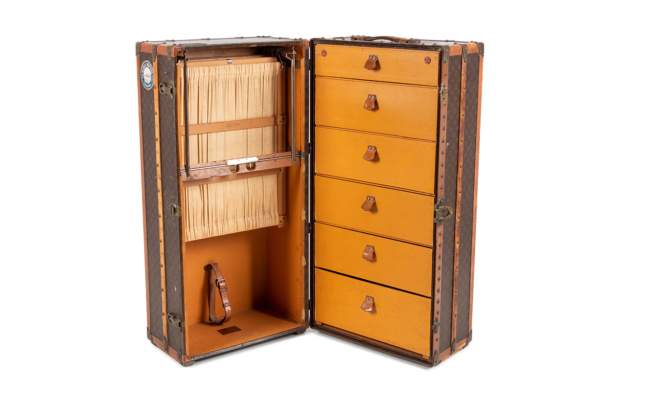 In addition to contemporary luxury accessories, this auction holds one of the very first “it bags”, with a Louis Vuitton steamer trunk (Lot 232) from the early twentieth century. While most Louis Vuitton trunks provide space for the transport of folded clothing and accessories, this trunk, known as the “Wardrobe Trunk”, also provides space (complete with Louis Vuitton-marked wooden hangers) for hanging clothing and comes with six drawers.